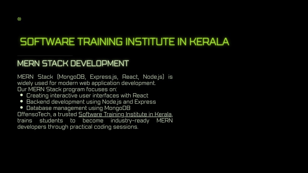MERN Stack (MongoDB, Express.js, React, Node.js) is widely used for modern web application development. Our MERN Stack program focuses on: Creating interactive user interfaces with React Backend development using Node.js and Express Database management using MongoDB OffensoTech, a trusted Software Training Institute in Kerala, trains developers through practical coding sessions. students to become industry-ready MERN