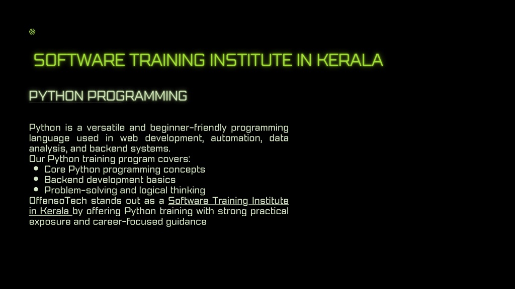 Python is a versatile and beginner-friendly programming language used in web development, automation, data analysis, and backend systems. Our Python training program covers: Core Python programming concepts Backend development basics Problem-solving and logical thinking OffensoTech stands out as a Software Training Institute in Kerala by offering Python training with strong practical exposure and career-focused guidance