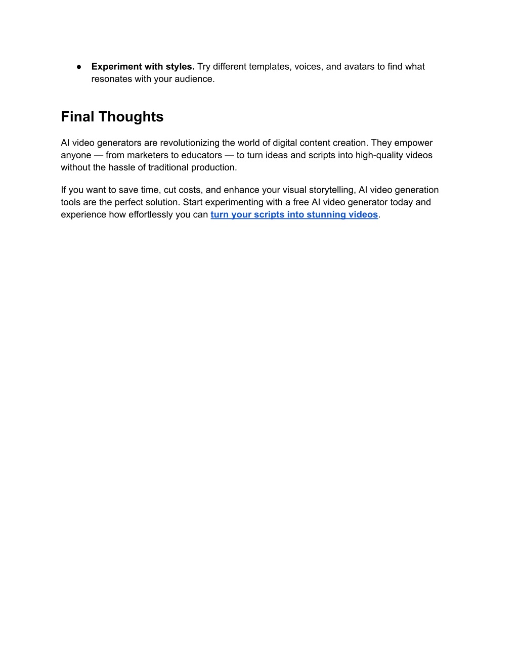 4. ● Experiment with styles. Try different templates, voices, and avatars to find what resonates with your audience. Final Thoughts AI video generators are revolutionizing the world of digital content creation. They empower anyone — from marketers to educators — to turn ideas and scripts into high-quality videos without the hassle of traditional production. If you want to save time, cut costs, and enhance your visual storytelling, AI video generation tools are the perfect solution. Start experimenting with a free AI video generator today and experience how effortlessly you can turn your scripts into stunning videos.