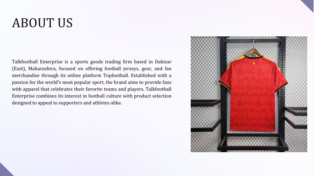 ABOUT US Talkfootball Enterprise is a sports goods trading firm based in Dahisar (East), Maharashtra, focused on offering football jerseys, gear, and fan merchandise through its online platform Topfootball. Established with a passion for the world’s most popular sport, the brand aims to provide fans with apparel that celebrates their favorite teams and players. Talkfootball Enterprise combines its interest in football culture with product selection designed to appeal to supporters and athletes alike.