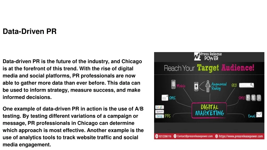 Data-Driven PR Data-driven PR is the future of the industry, and Chicago is at the forefront of this trend. With the rise of digital media and social platforms, PR professionals are now able to gather more data than ever before. This data can be used to inform strategy, measure success, and make informed decisions. One example of data-driven PR in action is the use of A/B testing. By testing different variations of a campaign or message, PR professionals in Chicago can determine which approach is most effective. Another example is the use of analytics tools to track website traffic and social media engagement.
