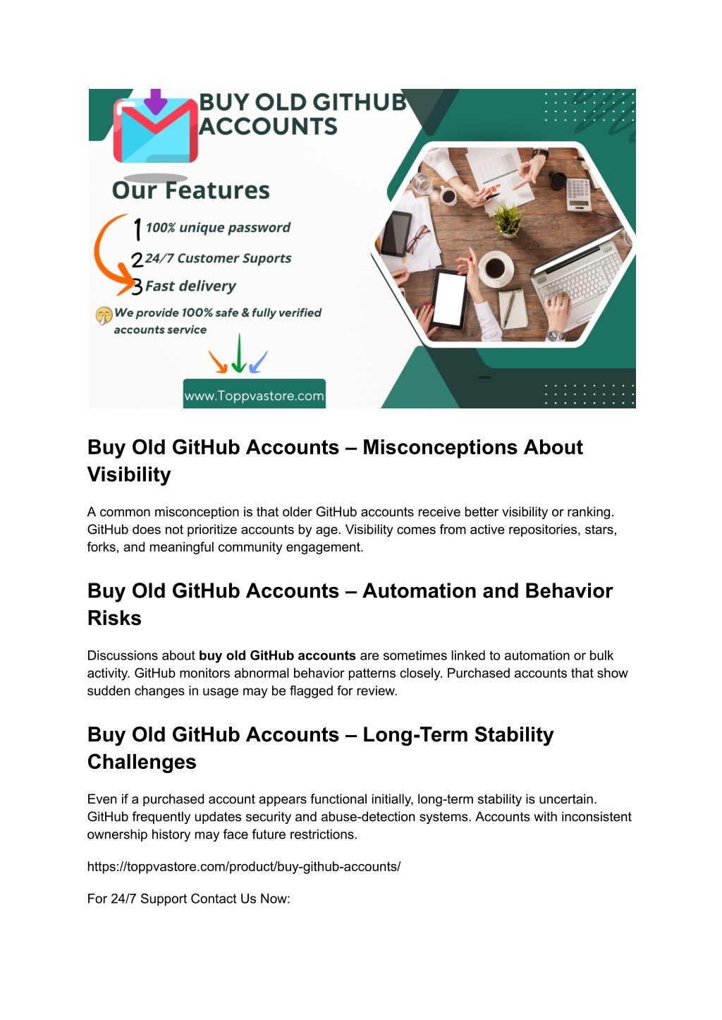 7. Buy Old GitHub Accounts – Misconceptions About Visibility A common misconception is that older GitHub accounts receive better visibility or ranking. GitHub does not prioritize accounts by age. Visibility comes from active repositories, stars, forks, and meaningful community engagement. Buy Old GitHub Accounts – Automation and Behavior Risks Discussions about buy old GitHub accounts are sometimes linked to automation or bulk activity. GitHub monitors abnormal behavior patterns closely. Purchased accounts that show sudden changes in usage may be flagged for review. Buy Old GitHub Accounts – Long-Term Stability Challenges Even if a purchased account appears functional initially, long-term stability is uncertain. GitHub frequently updates security and abuse-detection systems. Accounts with inconsistent ownership history may face future restrictions. https://toppvastore.com/product/buy-github-accounts/ For 24/7 Support Contact Us Now: