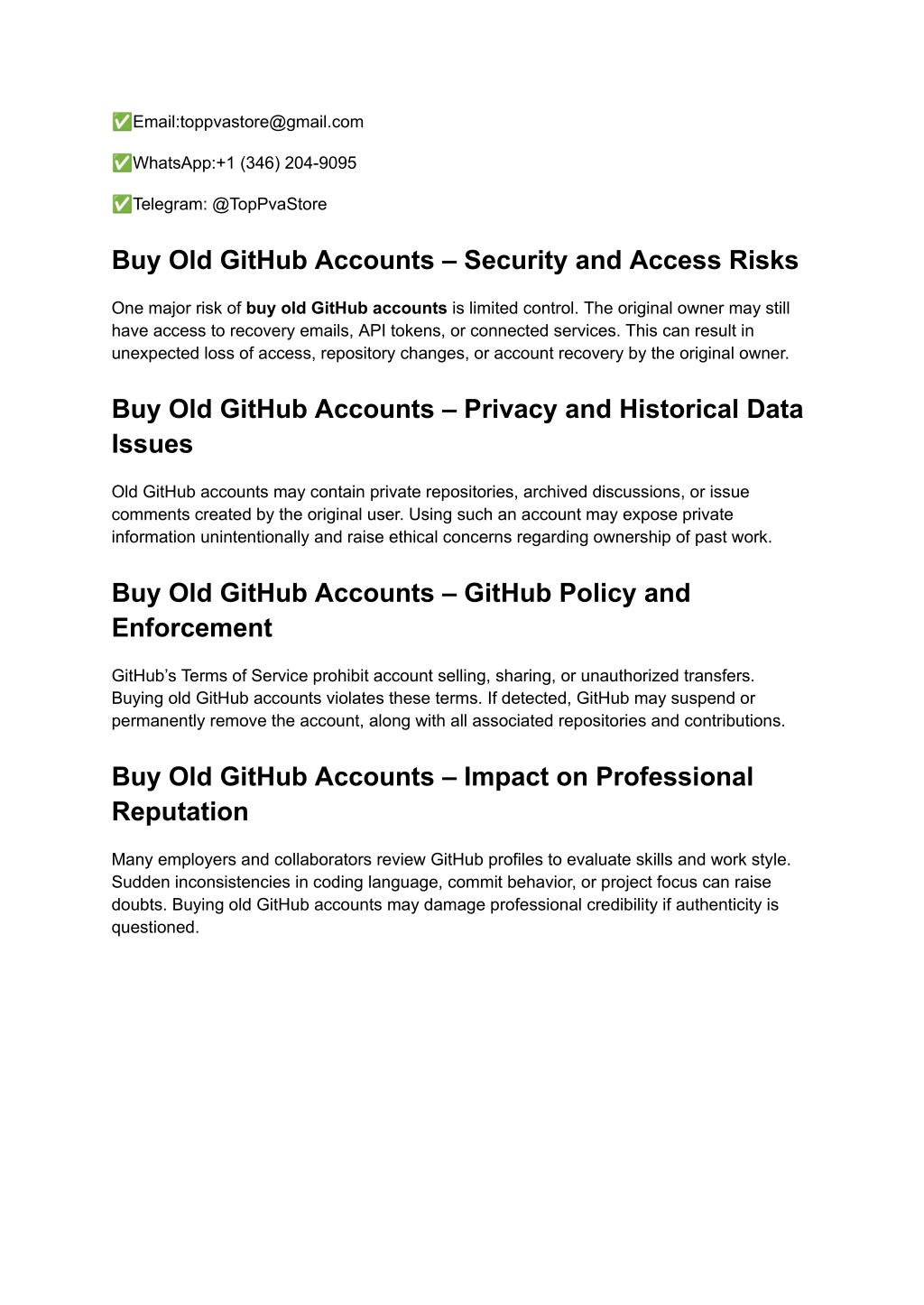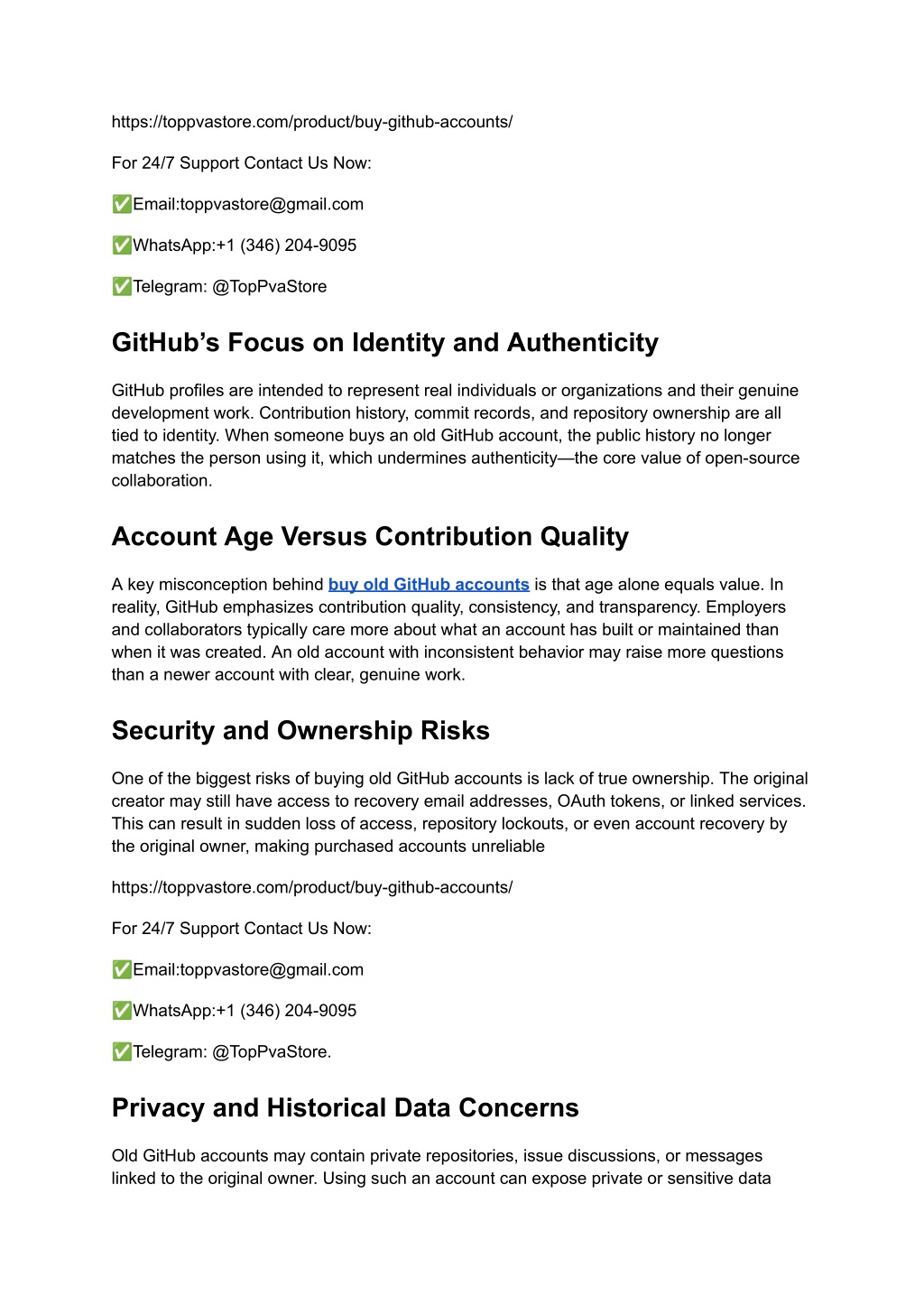 4. unintentionally. It can also create ethical concerns if previous work or identity is misrepresented as belonging to someone else. GitHub Policies and Enforcement GitHub’s Terms of Service prohibit account sharing, selling, or transferring. Accounts are meant to be used by the individual or organization that created them. Buying old GitHub accounts violates these terms and can lead to account suspension or permanent removal, including loss of repositories and contribution history. Reputation and Professional Impact GitHub profiles are often reviewed by employers and collaborators. Inconsistencies in language, coding style, commit history, or project focus can be noticeable. If doubts arise about authenticity, professional credibility may suffer. In technical communities, trust and transparency are highly valued. Automation and Misuse Concerns Some discussions around buy old GitHub accounts are tied to automation or mass activity. GitHub actively monitors for abnormal behavior, including sudden changes in usage patterns. Purchased accounts that shift behavior abruptly may attract additional scrutiny, increasing the risk of enforcement. https://toppvastore.com/product/buy-github-accounts/ For 24/7 Support Contact Us Now: ✅Email:toppvastore@gmail.com ✅WhatsApp:+1 (346) 204-9095 ✅Telegram: @TopPvaStore Long-Term Stability Issues Even if a purchased account appears usable at first, long-term stability is uncertain. GitHub continuously improves security and abuse detection. Accounts that avoid issues temporarily may be flagged later, especially if ownership changes are detected. Safer Alternatives to Buying Old GitHub Accounts Instead of buying old GitHub accounts, building a genuine profile offers far more value. Creating repositories, contributing to open-source projects, documenting work clearly, and