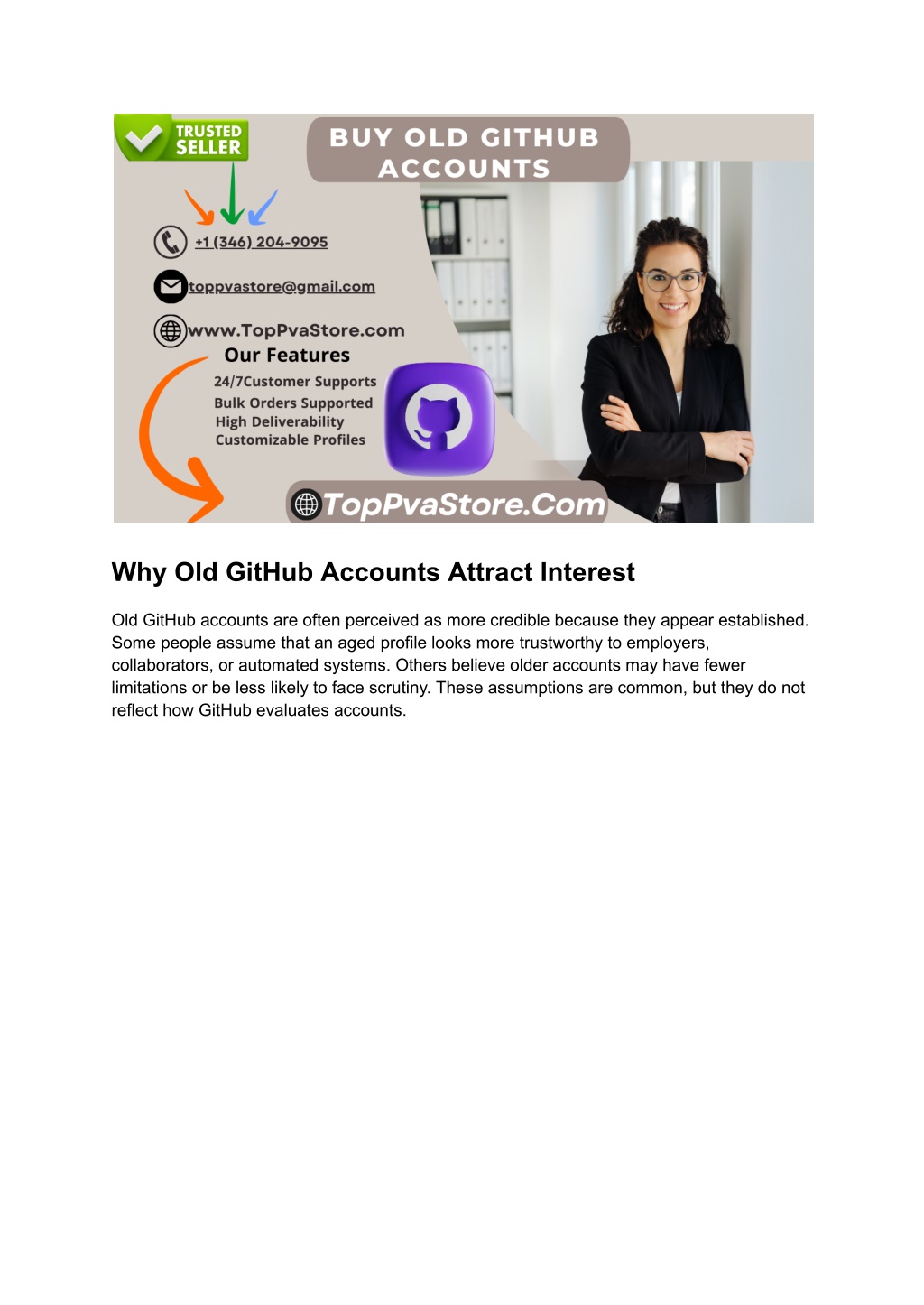 1. Buy Old GitHub Accounts: An Informational Overview Introduction The search phrasebuy old GitHub accounts appears more often as GitHub continues to dominate the software development and open-source ecosystem. With millions of repositories, contributors, and organizations, GitHub profiles often act as public records of technical history and credibility. This visibility has led some users to explore the idea of acquiring older accounts rather than creating new ones. Understanding what this practice implies—and the risks involved—is essential before forming conclusions. https://toppvastore.com/product/buy-github-accounts/ For 24/7 Support Contact Us Now: ✅Email:toppvastore@gmail.com ✅WhatsApp:+1 (346) 204-9095 ✅Telegram: @TopPvaStore What People Mean by Buy Old GitHub Accounts When users refer to buy old GitHub accounts, they are usually talking about accounts that were created years ago and may show activity such as repositories, stars, followers, or contribution history. GitHub does not sell accounts and does not allow account transfers. Any account offered for purchase exists outside GitHub’s official rules and protections.