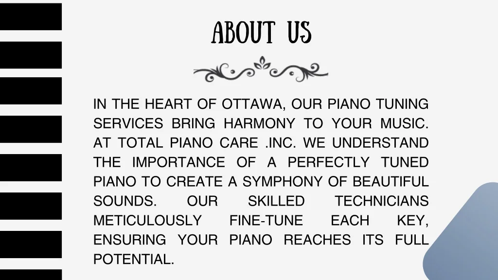 ABOUT US IN THE HEART OF OTTAWA, OUR PIANO TUNING SERVICES BRING HARMONY TO YOUR MUSIC. AT TOTAL PIANO CARE .INC. WE UNDERSTAND THE IMPORTANCE OF A PERFECTLY TUNED PIANO TO CREATE A SYMPHONY OF BEAUTIFUL SOUNDS. OUR SKILLED METICULOUSLY FINE-TUNE ENSURING YOUR PIANO REACHES ITS FULL POTENTIAL. TECHNICIANS EACH KEY,