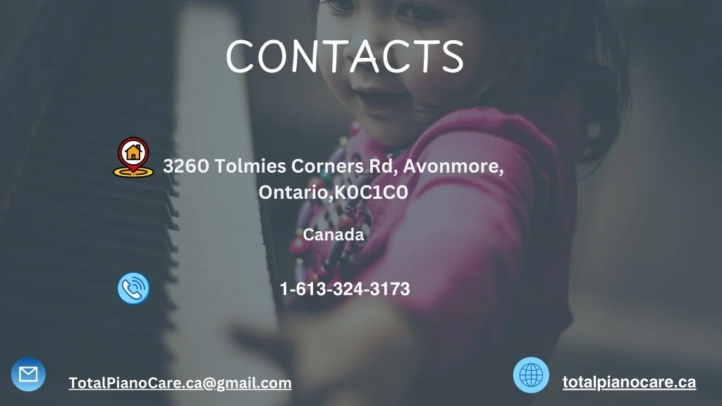 CONTACTS 3260 Tolmies Corners Rd, Avonmore, Ontario,K0C1C0 Canada 1-613-324-3173 totalpianocare.ca TotalPianoCare.ca@gmail.com