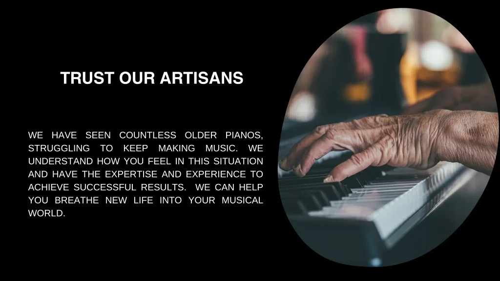 TRUST OUR ARTISANS WE HAVE SEEN COUNTLESS OLDER PIANOS, STRUGGLING TO KEEP MAKING MUSIC. WE UNDERSTAND HOW YOU FEEL IN THIS SITUATION AND HAVE THE EXPERTISE AND EXPERIENCE TO ACHIEVE SUCCESSFUL RESULTS. WE CAN HELP YOU BREATHE NEW LIFE INTO YOUR MUSICAL WORLD.