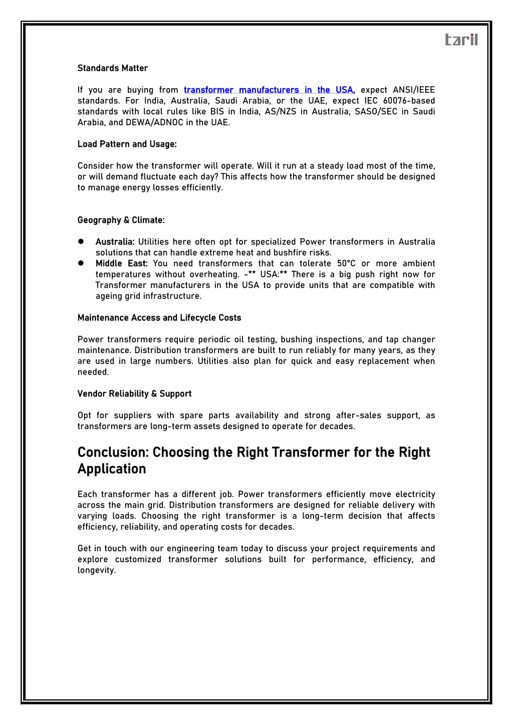 5. Standards Standards Matter Matter If you are buying from transformer standards. For India, Australia, Saudi Arabia, or the UAE, expect IEC 60076-based standards with local rules like BIS in India, AS/NZS in Australia, SASO/SEC in Saudi Arabia, and DEWA/ADNOC in the UAE. transformer manufacturers manufacturers in in the the USA USA, , expect ANSI/IEEE Load Load Pattern Pattern and and Usage: Usage: Consider how the transformer will operate. Will it run at a steady load most of the time, or will demand fluctuate each day? This affects how the transformer should be designed to manage energy losses efficiently. Geography Geography & & Climate: Climate:  Australia: Australia: Utilities here often opt for specialized Power transformers in Australia solutions that can handle extreme heat and bushfire risks. Middle Middle East: East: You need transformers that can tolerate 50°C or more ambient temperatures without overheating. -** USA:** There is a big push right now for Transformer manufacturers in the USA to provide units that are compatible with ageing grid infrastructure.  Maintenance Maintenance Access Access and and Lifecycle Lifecycle Costs Costs Power transformers require periodic oil testing, bushing inspections, and tap changer maintenance. Distribution transformers are built to run reliably for many years, as they are used in large numbers. Utilities also plan for quick and easy replacement when needed. Vendor Vendor Reliability Reliability & & Support Support Opt for suppliers with spare parts availability and strong after-sales support, as transformers are long-term assets designed to operate for decades. Conclusion: Conclusion: Choosing Application Application Choosing the the Right Right Transformer Transformer for for the the Right Right Each transformer has a different job. Power transformers efficiently move electricity across the main grid. Distribution transformers are designed for reliable delivery with varying loads. Choosing the right transformer is a long-term decision that affects efficiency, reliability, and operating costs for decades. Get in touch with our engineering team today to discuss your project requirements and explore customized transformer solutions built for performance, efficiency, and longevity.
