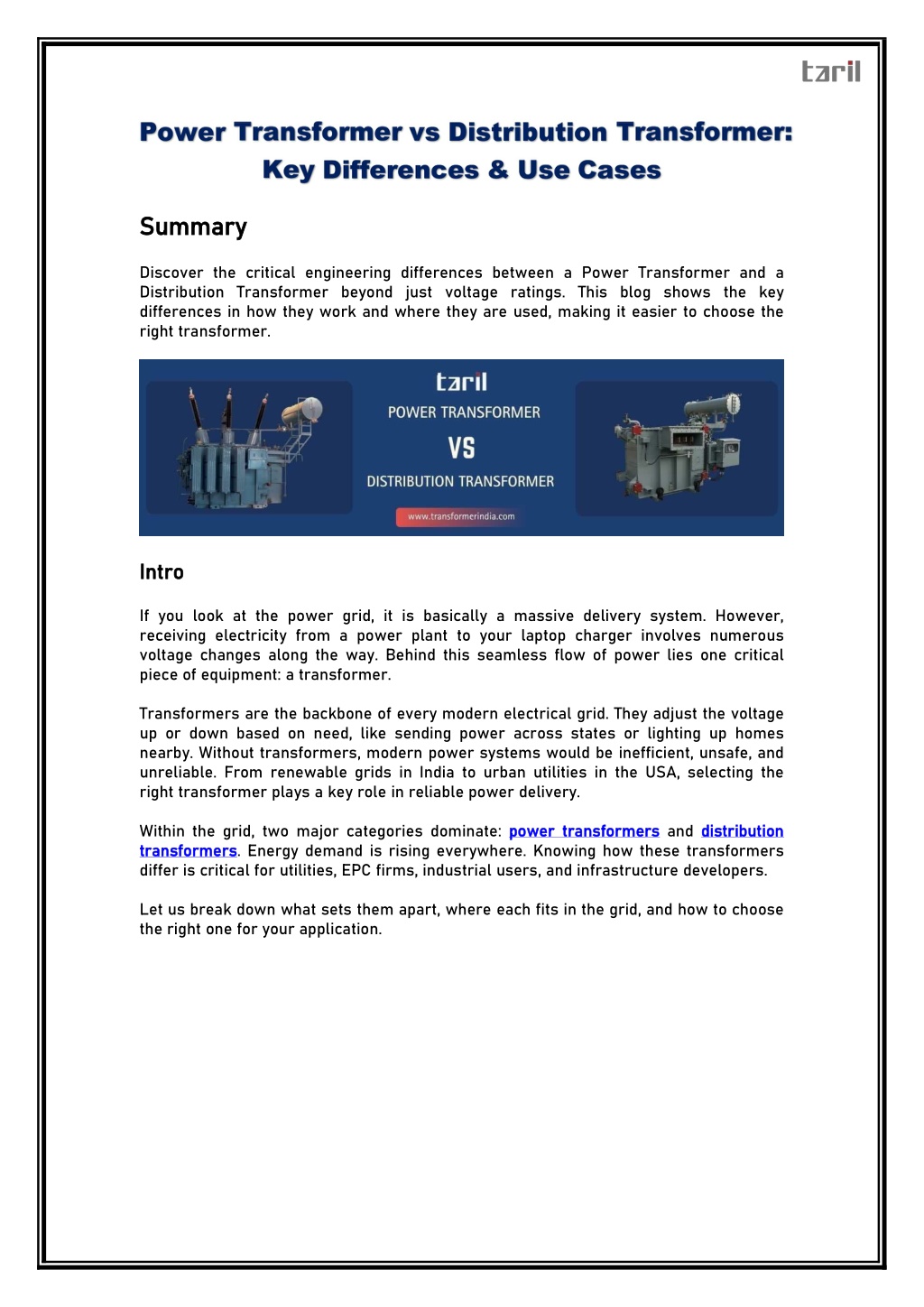 1. Summary Summary Discover the critical engineering differences between a Power Transformer and a Distribution Transformer beyond just voltage ratings. This blog shows the key differences in how they work and where they are used, making it easier to choose the right transformer. Intro Intro If you look at the power grid, it is basically a massive delivery system. However, receiving electricity from a power plant to your laptop charger involves numerous voltage changes along the way. Behind this seamless flow of power lies one critical piece of equipment: a transformer. Transformers are the backbone of every modern electrical grid. They adjust the voltage up or down based on need, like sending power across states or lighting up homes nearby. Without transformers, modern power systems would be inefficient, unsafe, and unreliable. From renewable grids in India to urban utilities in the USA, selecting the right transformer plays a key role in reliable power delivery. Within the grid, two major categories dominate: power transformers transformers. Energy demand is rising everywhere. Knowing how these transformers differ is critical for utilities, EPC firms, industrial users, and infrastructure developers. power transformers transformers and distribution distribution Let us break down what sets them apart, where each fits in the grid, and how to choose the right one for your application.