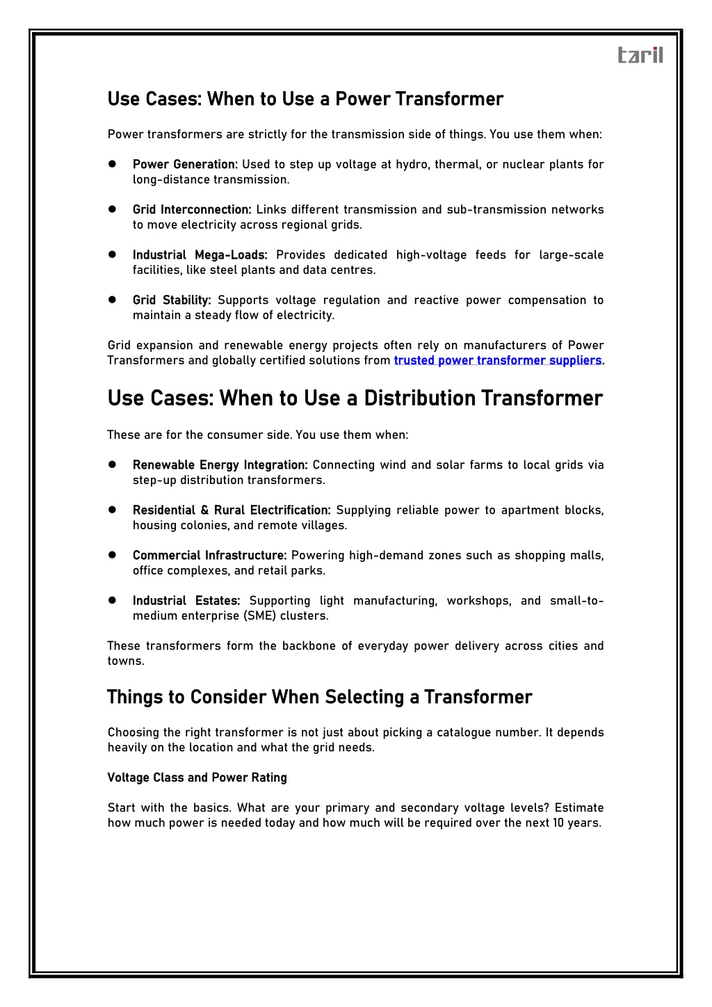 4. Use Use Cases: Cases: When When to to Use Use a a Power Power Transformer Transformer Power transformers are strictly for the transmission side of things. You use them when:  Power Power Generation: Generation: Used to step up voltage at hydro, thermal, or nuclear plants for long-distance transmission.  Grid Grid Interconnection: Interconnection: Links different transmission and sub-transmission networks to move electricity across regional grids.  Industrial Industrial Mega-Loads: Mega-Loads: Provides dedicated high-voltage feeds for large-scale facilities, like steel plants and data centres.  Grid Grid Stability: Stability: Supports voltage regulation and reactive power compensation to maintain a steady flow of electricity. Grid expansion and renewable energy projects often rely on manufacturers of Power Transformers and globally certified solutions from trusted trusted power power transformer transformer suppliers suppliers. . Use Use Cases: Cases: When When to to Use Use a a Distribution Distribution Transformer Transformer These are for the consumer side. You use them when:  Renewable Renewable Energy step-up distribution transformers. Energy Integration: Integration: Connecting wind and solar farms to local grids via  Residential Residential & & Rural housing colonies, and remote villages. Rural Electrification: Electrification: Supplying reliable power to apartment blocks,  Commercial Commercial Infrastructure: Infrastructure: Powering high-demand zones such as shopping malls, office complexes, and retail parks.  Industrial Industrial Estates: medium enterprise (SME) clusters. Estates: Supporting light manufacturing, workshops, and small-to- These transformers form the backbone of everyday power delivery across cities and towns. Things Things to to Consider Consider When When Selecting Selecting a a Transformer Transformer Choosing the right transformer is not just about picking a catalogue number. It depends heavily on the location and what the grid needs. Voltage Voltage Class Class and and Power Power Rating Rating Start with the basics. What are your primary and secondary voltage levels? Estimate how much power is needed today and how much will be required over the next 10 years.