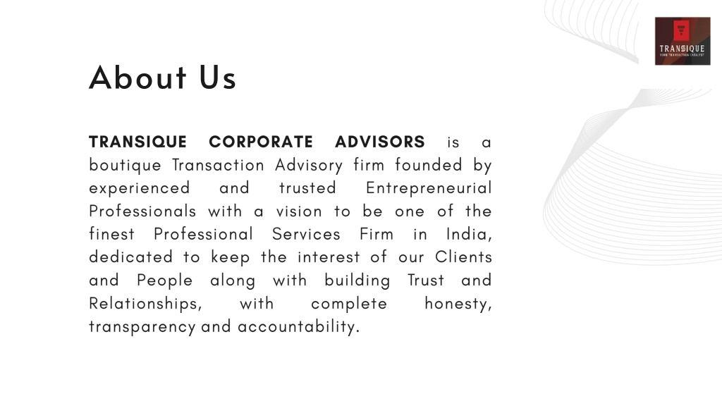 About Us TRANSIQUE CORPORATE ADVISORS is a boutique Transaction Advisory firm founded by experienced and trusted Entrepreneurial Professionals with a vision to be one of the finest Professional Services Firm in India, dedicated to keep the interest of our Clients and People along with building Trust and Relationships, with complete honesty, transparency and accountability.