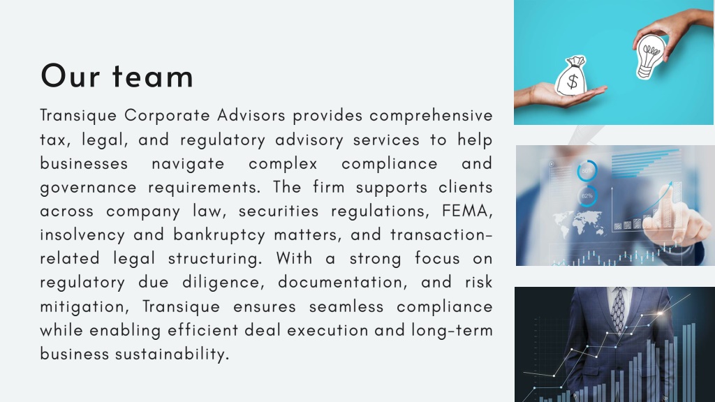 Our team Transique Corporate Advisors provides comprehensive tax, legal, and regulatory advisory services to help businesses navigate complex compliance and governance requirements. The firm supports clients across company law, securities regulations, FEMA, insolvency and bankruptcy matters, and transaction-related legal structuring. With a strong focus on regulatory due diligence, documentation, and risk mitigation, Transique ensures seamless compliance while enabling efficient deal execution and long-term business sustainability.