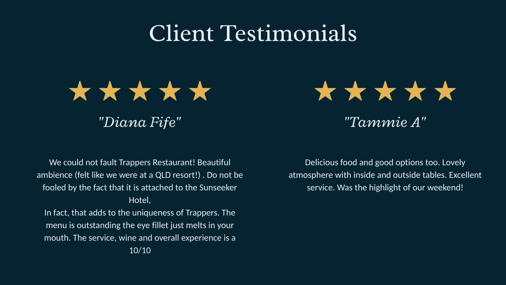 Client Testimonials "Diana Fife" "Tammie A" We could not fault Trappers Restaurant! Beautiful ambience (felt like we were at a QLD resort!) . Do not be fooled by the fact that it is attached to the Sunseeker Hotel, In fact, that adds to the uniqueness of Trappers. The menu is outstanding the eye fillet just melts in your mouth. The service, wine and overall experience is a 10/10 Delicious food and good options too. Lovely atmosphere with inside and outside tables. Excellent service. Was the highlight of our weekend!
