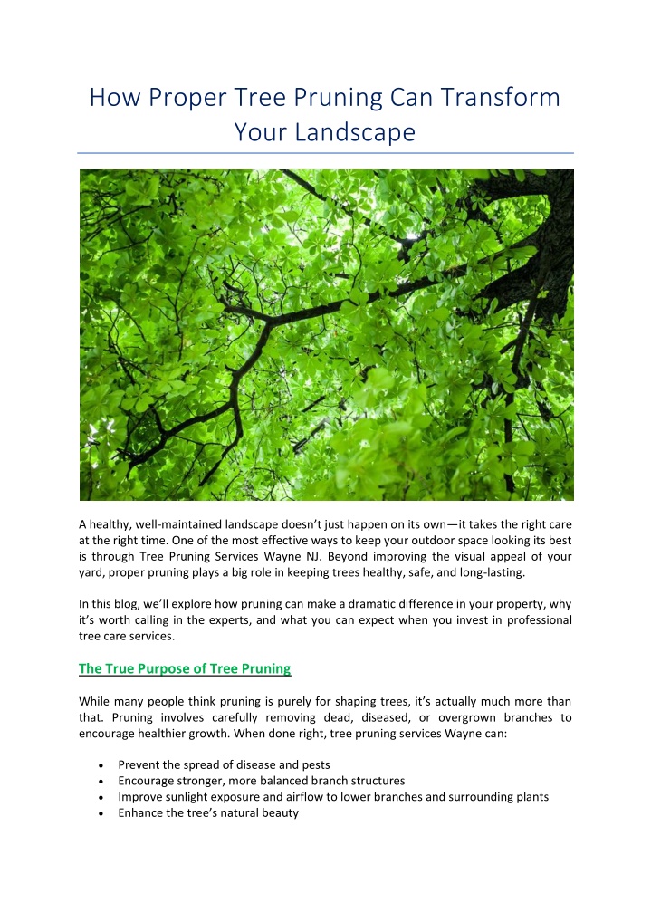 How Proper Tree Pruning Can Transform Your Landscape A healthy, well-maintained landscape doesn’t just happen on its own—it takes the right care at the right time. One of the most effective ways to keep your outdoor space looking its best is through Tree Pruning Services Wayne NJ. Beyond improving the visual appeal of your yard, proper pruning plays a big role in keeping trees healthy, safe, and long-lasting. In this blog, we’ll explore how pruning can make a dramatic difference in your property, why it’s worth calling in the experts, and what you can expect when you invest in professional tree care services. The True Purpose of Tree Pruning While many people think pruning is purely for shaping trees, it’s actually much more than that. Pruning involves carefully removing dead, diseased, or overgrown branches to encourage healthier growth. When done right, tree pruning services Wayne can: Prevent the spread of disease and pests Encourage stronger, more balanced branch structures Improve sunlight exposure and airflow to lower branches and surrounding plants Enhance the tree’s natural beauty