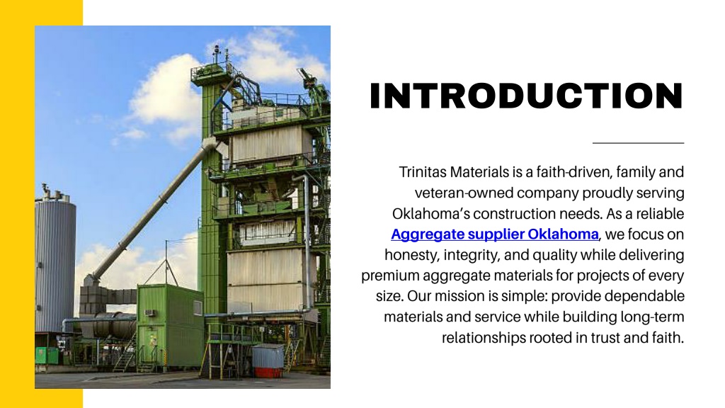 2. INTRODUCTION Trinitas Materials is a faith-driven, family and veteran-owned company proudly serving Oklahoma’s construction needs. As a reliable Aggregate supplier Oklahoma, we focus on honesty, integrity, and quality while delivering premium aggregate materials for projects of every size. Our mission is simple: provide dependable materials and service while building long-term relationships rooted in trust and faith.