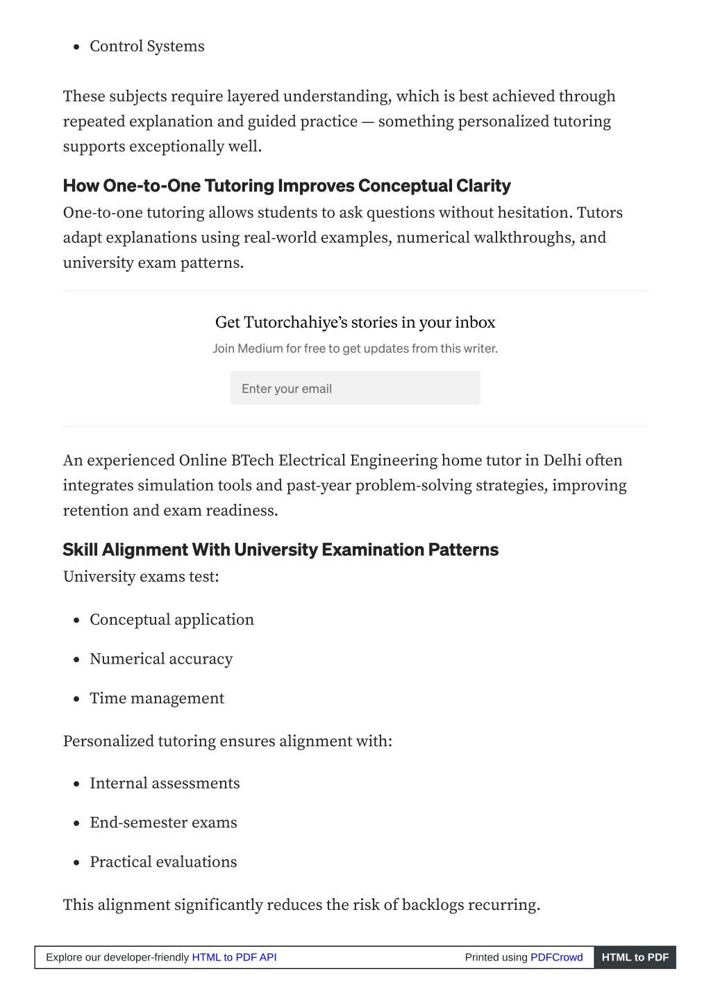Control Systems These subjects require layered understanding, which is best achieved through repeated explanation and guided practice — something personalized tutoring supports exceptionally well. How One-to-One Tutoring Improves Conceptual Clarity One-to-one tutoring allows students to ask questions without hesitation. Tutors adapt explanations using real-world examples, numerical walkthroughs, and university exam patterns. Get Tutorchahiye’s stories in your inbox Join Medium for free to get updates from this writer. Enter your email An experienced Online BTech Electrical Engineering home tutor in Delhi often integrates simulation tools and past-year problem-solving strategies, improving retention and exam readiness. Skill Alignment With University Examination Patterns University exams test: Conceptual application Numerical accuracy Time management Personalized tutoring ensures alignment with: Internal assessments End-semester exams Practical evaluations This alignment significantly reduces the risk of backlogs recurring. Explore our developer-friendly HTML to PDF API Printed using PDFCrowd HTML to PDF