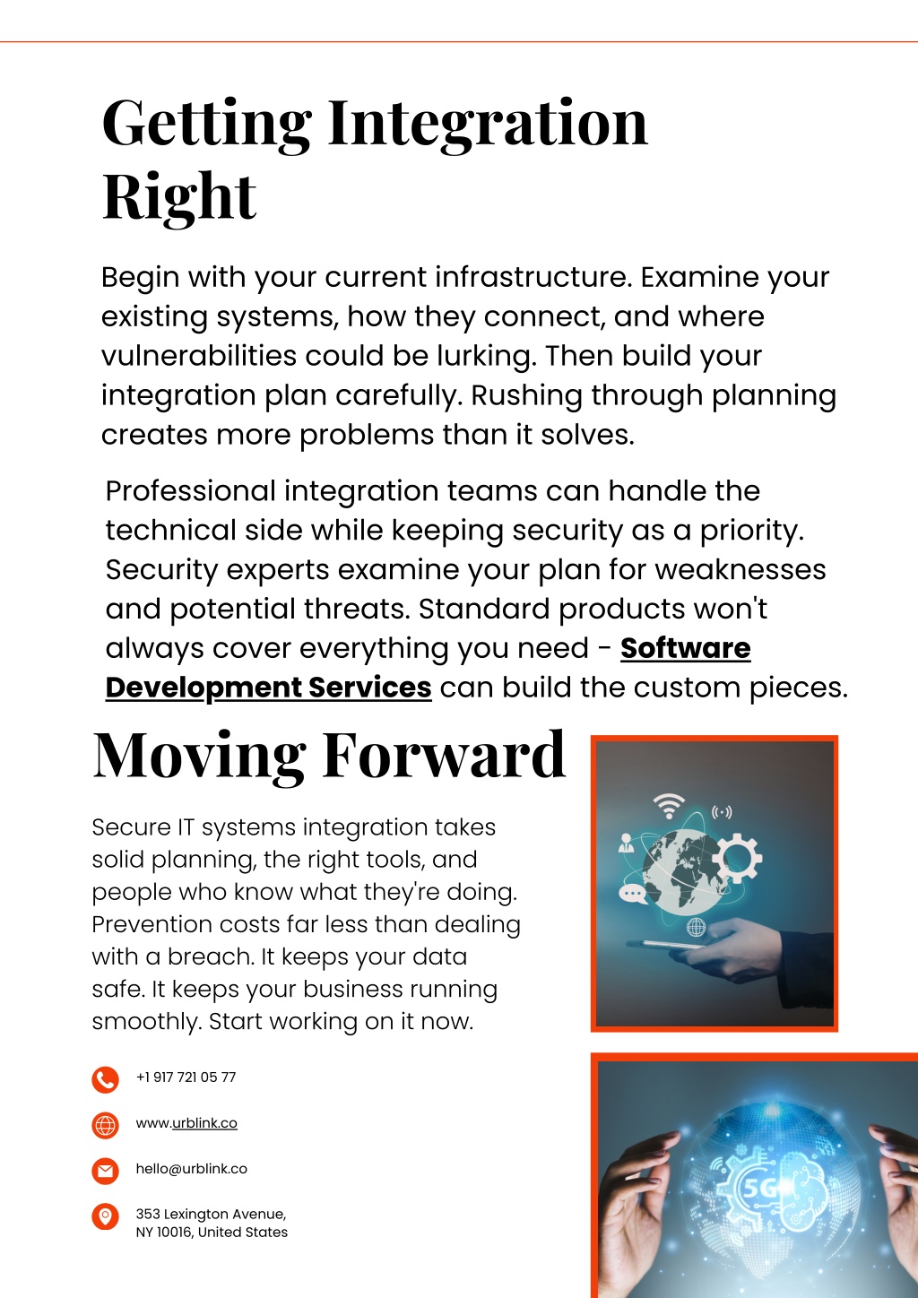 3. Getting Integration Right Begin with your current infrastructure. Examine your existing systems, how they connect, and where vulnerabilities could be lurking. Then build your integration plan carefully. Rushing through planning creates more problems than it solves. Professional integration teams can handle the technical side while keeping security as a priority. Security experts examine your plan for weaknesses and potential threats. Standard products won't always cover everything you need - Software Development Services can build the custom pieces. Moving Forward Secure IT systems integration takes solid planning, the right tools, and people who know what they're doing. Prevention costs far less than dealing with a breach. It keeps your data safe. It keeps your business running smoothly. Start working on it now. +1 917 721 05 77 www.urblink.co hello@urblink.co 353 Lexington Avenue, NY 10016, United States