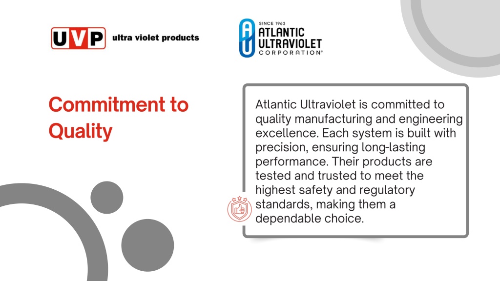 Commitment to Quality • Atlantic Ultraviolet is committed to quality manufacturing and engineering excellence. Each system is built with precision, ensuring long-lasting performance. Their products are tested and trusted to meet the highest safety and regulatory standards, making them a dependable choice.