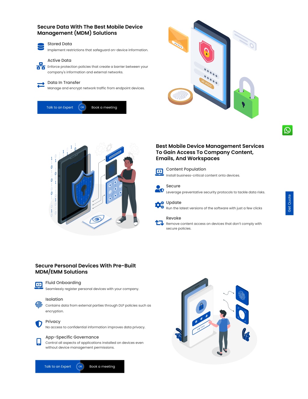 Secure Data With The Best Mobile Device Management (MDM) Solutions Stored Data Implement restrictions that safeguard on-device information. Active Data Enforce protection policies that create a barrier between your company's information and external networks. Data In Transfer Manage and encrypt network traffic from endpoint devices. Talk to an Expert Book a meeting OR Best Mobile Device Management Services To Gain Access To Company Content, Emails, And Workspaces Content Population Install business-critical content onto devices. Secure Leverage preventative security protocols to tackle data risks. Get Quote Update Run the latest versions of the software with just a few clicks Revoke Remove content access on devices that don’t comply with secure policies. Secure Personal Devices With Pre-Built MDM/EMM Solutions Fluid Onboarding Seamlessly register personal devices with your company. Isolation Contains data from external parties through DLP policies such as encryption. Privacy No access to confidential information improves data privacy. e n t e r App-Specific Governance Control all aspects of applications installed on devices even without device management permissions. Talk to an Expert Book a meeting OR