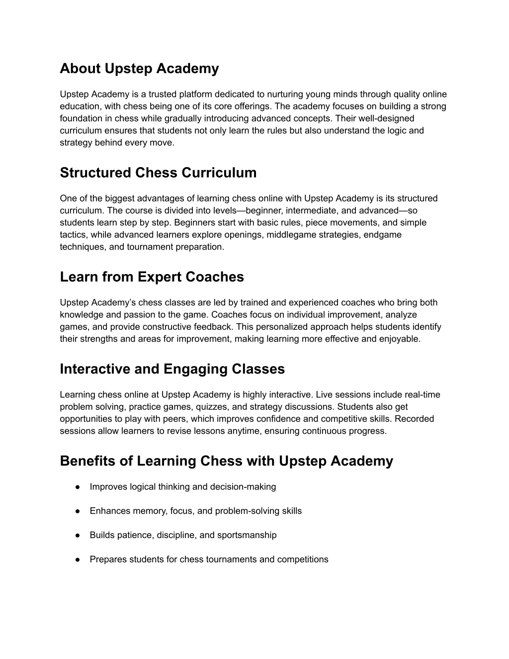 About Upstep Academy Upstep Academy is a trusted platform dedicated to nurturing young minds through quality online education, with chess being one of its core offerings. The academy focuses on building a strong foundation in chess while gradually introducing advanced concepts. Their well-designed curriculum ensures that students not only learn the rules but also understand the logic and strategy behind every move. Structured Chess Curriculum One of the biggest advantages of learning chess online with Upstep Academy is its structured curriculum. The course is divided into levels—beginner, intermediate, and advanced—so students learn step by step. Beginners start with basic rules, piece movements, and simple tactics, while advanced learners explore openings, middlegame strategies, endgame techniques, and tournament preparation. Learn from Expert Coaches Upstep Academy’s chess classes are led by trained and experienced coaches who bring both knowledge and passion to the game. Coaches focus on individual improvement, analyze games, and provide constructive feedback. This personalized approach helps students identify their strengths and areas for improvement, making learning more effective and enjoyable. Interactive and Engaging Classes Learning chess online at Upstep Academy is highly interactive. Live sessions include real-time problem solving, practice games, quizzes, and strategy discussions. Students also get opportunities to play with peers, which improves confidence and competitive skills. Recorded sessions allow learners to revise lessons anytime, ensuring continuous progress. Benefits of Learning Chess with Upstep Academy ● Improves logical thinking and decision-making ● Enhances memory, focus, and problem-solving skills ● Builds patience, discipline, and sportsmanship ● Prepares students for chess tournaments and competitions