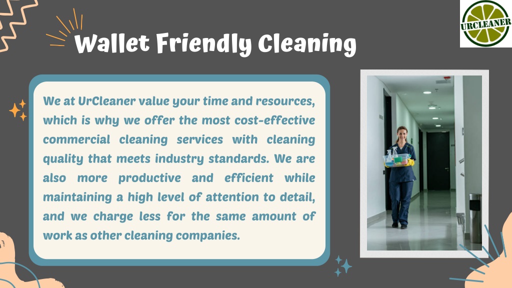 Wallet Friendly Cleaning We at UrCleaner value your time and resources, which is why we offer the most cost-effective commercial cleaning services with cleaning quality that meets industry standards. We are also more productive and efficient while maintaining a high level of attention to detail, and we charge less for the same amount of work as other cleaning companies.