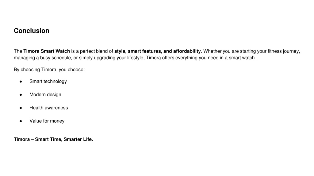 10. Conclusion The Timora Smart Watch is a perfect blend of style, smart features, and affordability. Whether you are starting your fitness journey, managing a busy schedule, or simply upgrading your lifestyle, Timora offers everything you need in a smart watch. By choosing Timora, you choose: • Smart technology • Modern design • Health awareness • Value for money Timora – Smart Time, Smarter Life.