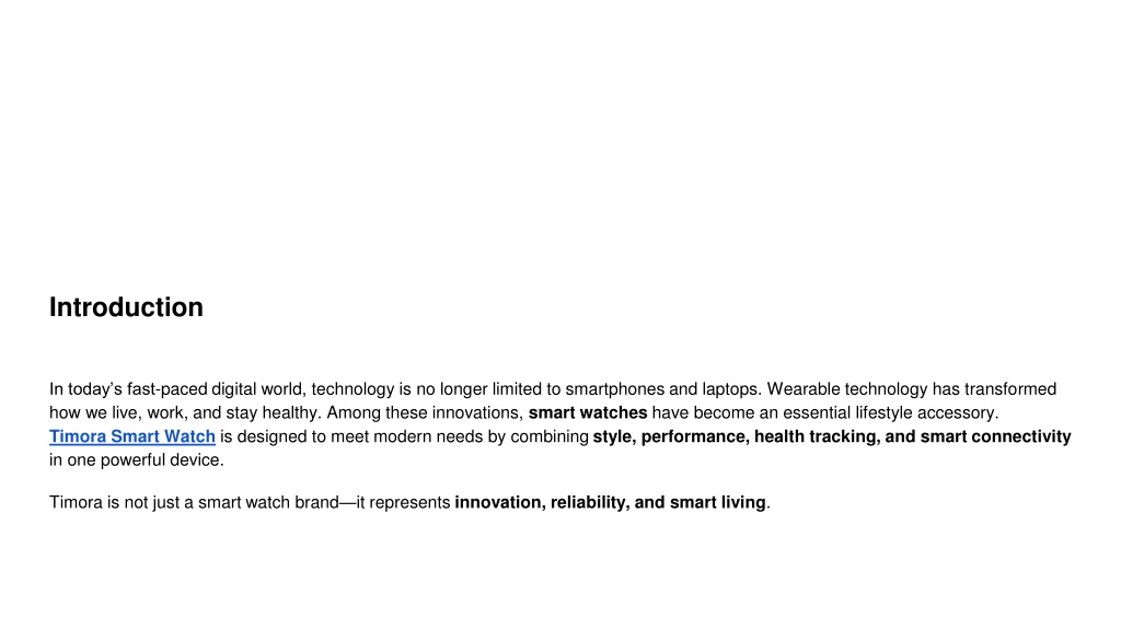 3. Why Timora Smart Watch Stands Out The smart watch market is crowded, but Timora stands out due to its focus on quality, affordability, and advanced features. Key Highlights of Timora: • Sleek and modern design • Advanced health sensors • Long battery life • Easy smartphone connectivity • Affordable pricing Timora smart watches are designed for professionals, fitness lovers, students, and everyday users.