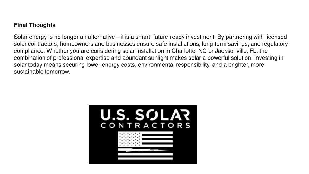 Final Thoughts Solar energy is no longer an alternative—it is a smart, future-ready investment. By partnering with licensed solar contractors, homeowners and businesses ensure safe installations, long-term savings, and regulatory compliance. Whether you are considering solar installation in Charlotte, NC or Jacksonville, FL, the combination of professional expertise and abundant sunlight makes solar a powerful solution. Investing in solar today means securing lower energy costs, environmental responsibility, and a brighter, more sustainable tomorrow.