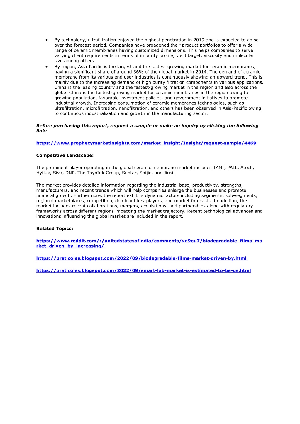By technology, ultrafiltration enjoyed the highest penetration in 2019 and is expected to do so over the forecast period. Companies have broadened their product portfolios to offer a wide range of ceramic membranes having customized dimensions. This helps companies to serve varying client requirements in terms of impurity profile, yield target, viscosity and molecular size among others. By region, Asia-Pacific is the largest and the fastest growing market for ceramic membranes, having a significant share of around 36% of the global market in 2014. The demand of ceramic membrane from its various end user industries is continuously showing an upward trend. This is mainly due to the increasing demand of high purity filtration components in various applications. China is the leading country and the fastest-growing market in the region and also across the globe. China is the fastest-growing market for ceramic membranes in the region owing to growing population, favorable investment policies, and government initiatives to promote industrial growth. Increasing consumption of ceramic membranes technologies, such as ultrafiltration, microfiltration, nanofiltration, and others has been observed in Asia-Pacific owing to continuous industrialization and growth in the manufacturing sector. Before purchasing this report, request a sample or make an inquiry by clicking the following link: https://www.prophecymarketinsights.com/market_insight/Insight/request-sample/4469 Competitive Landscape: The prominent player operating in the global ceramic membrane market includes TAMI, PALL, Atech, Hyflux, Siva, DNP, The ToyoInk Group, Suntar, Shijie, and Jiusi. The market provides detailed information regarding the industrial base, productivity, strengths, manufacturers, and recent trends which will help companies enlarge the businesses and promote financial growth. Furthermore, the report exhibits dynamic factors including segments, sub-segments, regional marketplaces, competition, dominant key players, and market forecasts. In addition, the market includes recent collaborations, mergers, acquisitions, and partnerships along with regulatory frameworks across different regions impacting the market trajectory. Recent technological advances and innovations influencing the global market are included in the report. Related Topics: https://www.reddit.com/r/unitedstatesofindia/comments/xq9eu7/biodegradable_films_ma rket_driven_by_increasing/ https://praticoles.blogspot.com/2022/09/biodegradable-films-market-driven-by.html https://praticoles.blogspot.com/2022/09/smart-lab-market-is-estimated-to-be-us.html