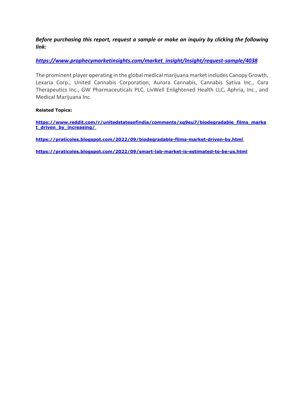 Before purchasing this report, request a sample or make an inquiry by clicking the following link: https://www.prophecymarketinsights.com/market_insight/Insight/request-sample/4038 The prominent player operating in the global medical marijuana market includes Canopy Growth, Lexaria Corp., United Cannabis Corporation, Aurora Cannabis, Cannabis Sativa Inc., Cara Therapeutics Inc., GW Pharmaceuticals PLC, LivWell Enlightened Health LLC, Aphria, Inc., and Medical Marijuana Inc. Related Topics: https://www.reddit.com/r/unitedstatesofindia/comments/xq9eu7/biodegradable_films_marke t_driven_by_increasing/ https://praticoles.blogspot.com/2022/09/biodegradable-films-market-driven-by.html https://praticoles.blogspot.com/2022/09/smart-lab-market-is-estimated-to-be-us.html