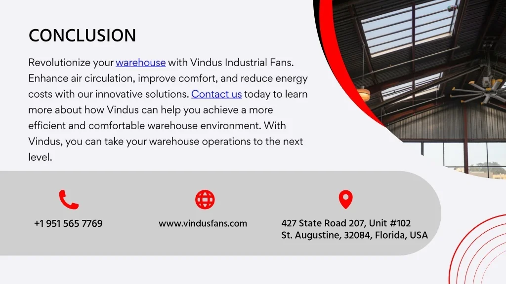 CONCLUSION • Revolutionize your warehouse with Vindus Industrial Fans. Enhance air circulation, improve comfort, and reduce energy costs with our innovative solutions. Contact us today to learn more about how Vindus can help you achieve a more efficient and comfortable warehouse environment. With Vindus, you can take your warehouse operations to the next level. +1 951 565 7769 427 State Road 207, Unit #102 St. Augustine, 32084, Florida, USA www.vindusfans.com