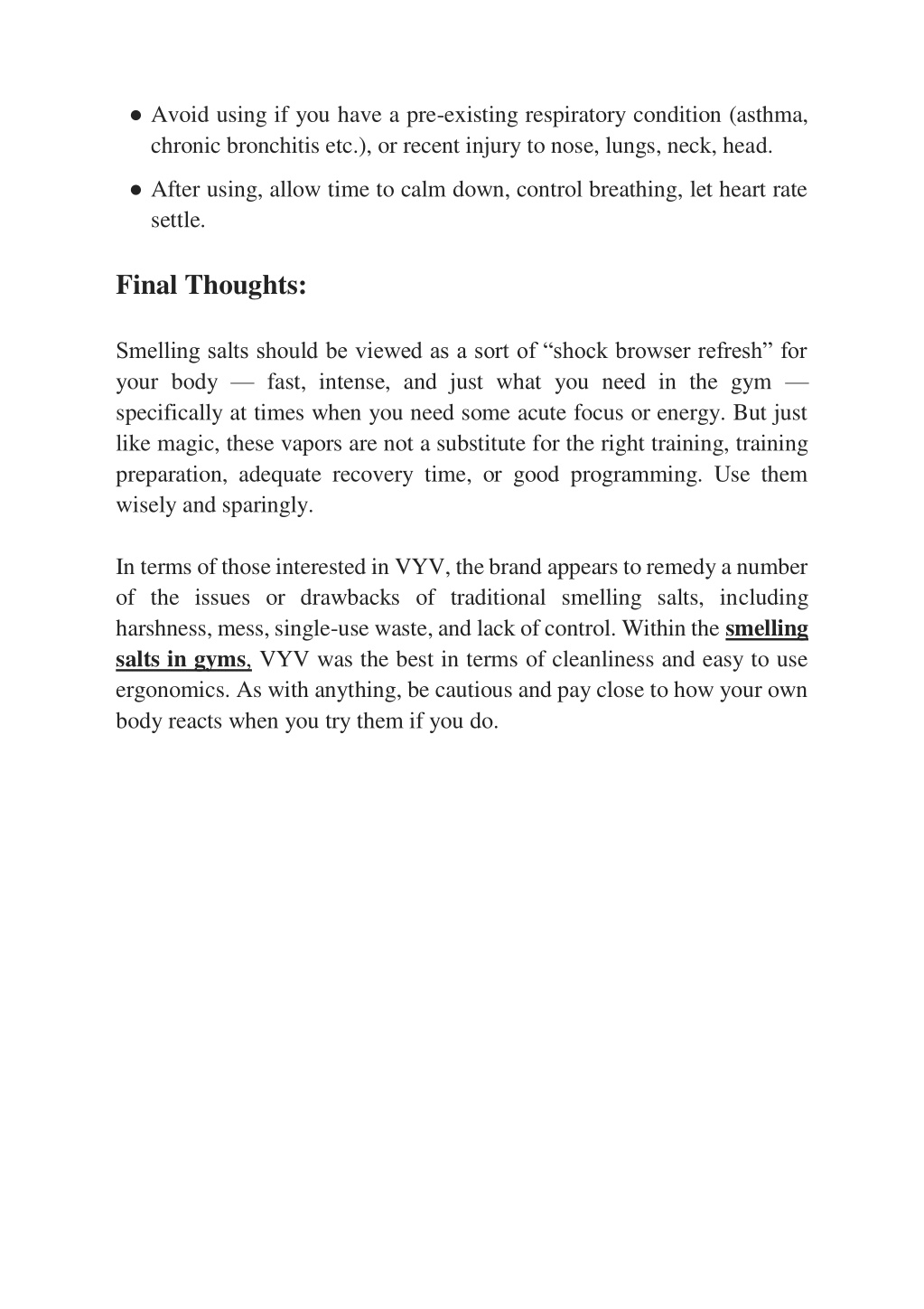 ●Avoid using if you have a pre-existing respiratory condition (asthma, chronic bronchitis etc.), or recent injury to nose, lungs, neck, head. ●After using, allow time to calm down, control breathing, let heart rate settle. Final Thoughts: Smelling salts should be viewed as a sort of “shock browser refresh” for your body — fast, intense, and just what you need in the gym — specifically at times when you need some acute focus or energy. But just like magic, these vapors are not a substitute for the right training, training preparation, adequate recovery time, or good programming. Use them wisely and sparingly. In terms of those interested in VYV, the brand appears to remedy a number of the issues or drawbacks of traditional smelling salts, including harshness, mess, single-use waste, and lack of control. Within the smelling salts in gyms, VYV was the best in terms of cleanliness and easy to use ergonomics. As with anything, be cautious and pay close to how your own body reacts when you try them if you do.