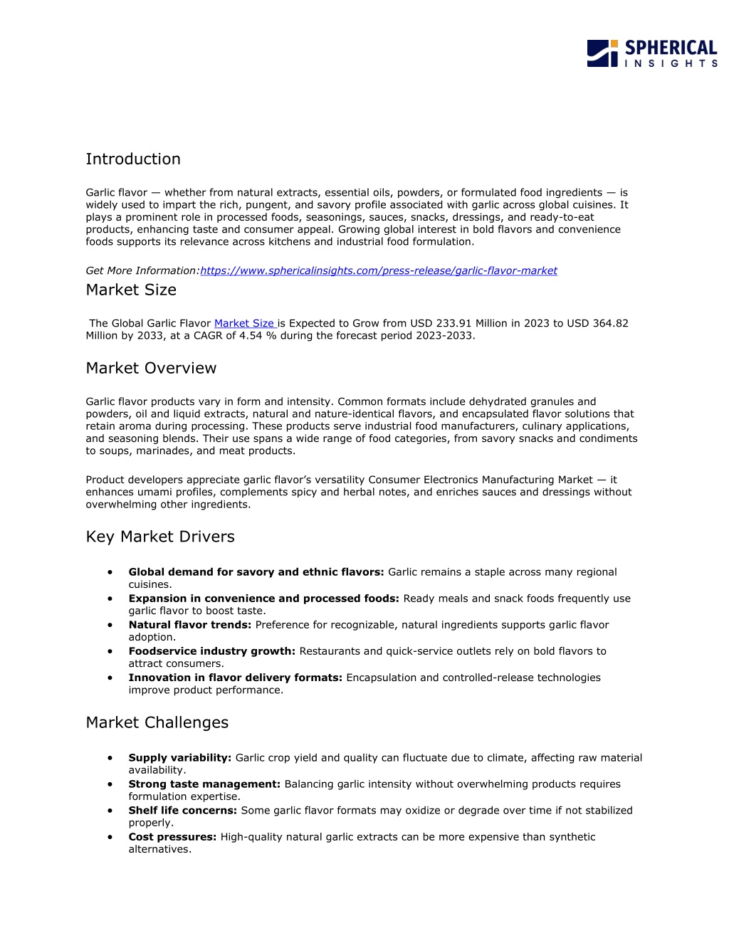 label expectations. Growth will remain measured, reflecting both traditional usage and innovation in new food categories. Conclusion Garlic flavor remains one of the most recognizable and widely used savory components across global food categories. Its adaptability, cultural resonance, and ability to enhance food profiles make it a staple in both industrial formulation and home cooking. Market dynamics will continue to balance tradition with innovation as food trends and formulation technologies evolve. Hashtags #GarlicFlavor #FoodFlavoring #SavoryFlavors #CulinaryIngredients #FlavorInnovation #FoodManufacturing #GlobalFoodMarket #CleanLabel #FoodTrends Releted URL: https://www.sphericalinsights.com/our-insights/household-vacuum-cleaner-market https://www.sphericalinsights.com/our-insights/licensed-football-merchandise-market https://www.sphericalinsights.com/our-insights/automotive-metals-market https://www.sphericalinsights.com/our-insights/dock-floats-market About the Spherical Insights & Consulting Spherical Insights& Consulting is a market research and consulting firm which provides actionable market research study, quantitative forecasting and trends analysis provides forward-looking insight especially designed for decision makers and aids ROI. Which is catering to different industry such as financial sectors, industrial sectors, government organizations, universities, non-profits and corporations. The company's mission is to work with businesses to achieve business objectives and maintain strategic improvements. CONTACT US: For More Information on Your Target Market, Please Contact Us Below: Phone: +1 303 800 4326 (the U.S.) Phone: +91 90289 24100 (APAC) Email: inquiry@sphericalinsights.com,sales@sphericalinsights.com Contact Us: https://www.sphericalinsights.com/contact-us Follow Us: LinkedIn | Facebook | Twit