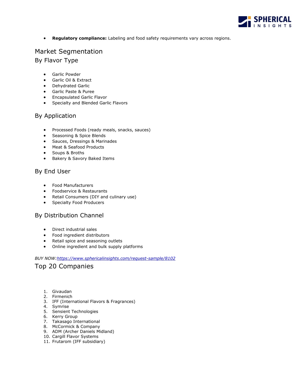 Regulatory compliance: Labeling and food safety requirements vary across regions. Market Segmentation By Flavor Type Garlic Powder Garlic Oil & Extract Dehydrated Garlic Garlic Paste & Puree Encapsulated Garlic Flavor Specialty and Blended Garlic Flavors By Application Processed Foods (ready meals, snacks, sauces) Seasoning & Spice Blends Sauces, Dressings & Marinades Meat & Seafood Products Soups & Broths Bakery & Savory Baked Items By End User Food Manufacturers Foodservice & Restaurants Retail Consumers (DIY and culinary use) Specialty Food Producers By Distribution Channel Direct industrial sales Food ingredient distributors Retail spice and seasoning outlets Online ingredient and bulk supply platforms BUY NOW:https://www.sphericalinsights.com/request-sample/8102 Top 20 Companies 1.Givaudan 2.Firmenich 3.IFF (International Flavors & Fragrances) 4.Symrise 5.Sensient Technologies 6.Kerry Group 7.Takasago International 8.McCormick & Company 9.ADM (Archer Daniels Midland) 10.Cargill Flavor Systems 11.Frutarom (IFF subsidiary)