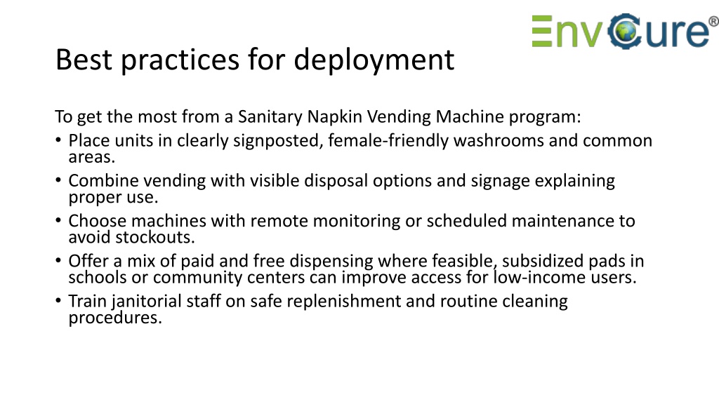 8. Conclusion • A Sanitary Napkin Vending Machine is a practical, dignified solution that enhances hygiene access across public and private spaces. Whether you need a simple napkin dispenser machine for a small facility or a connected network of Sanitary Pad Vending Machine units for large campuses, the right system improves user comfort and operational efficiency. For proven products, installation, and after-sales support, consider EnvCure Technocrat LLP, specialists in sanitary vending and comprehensive hygiene solutions.