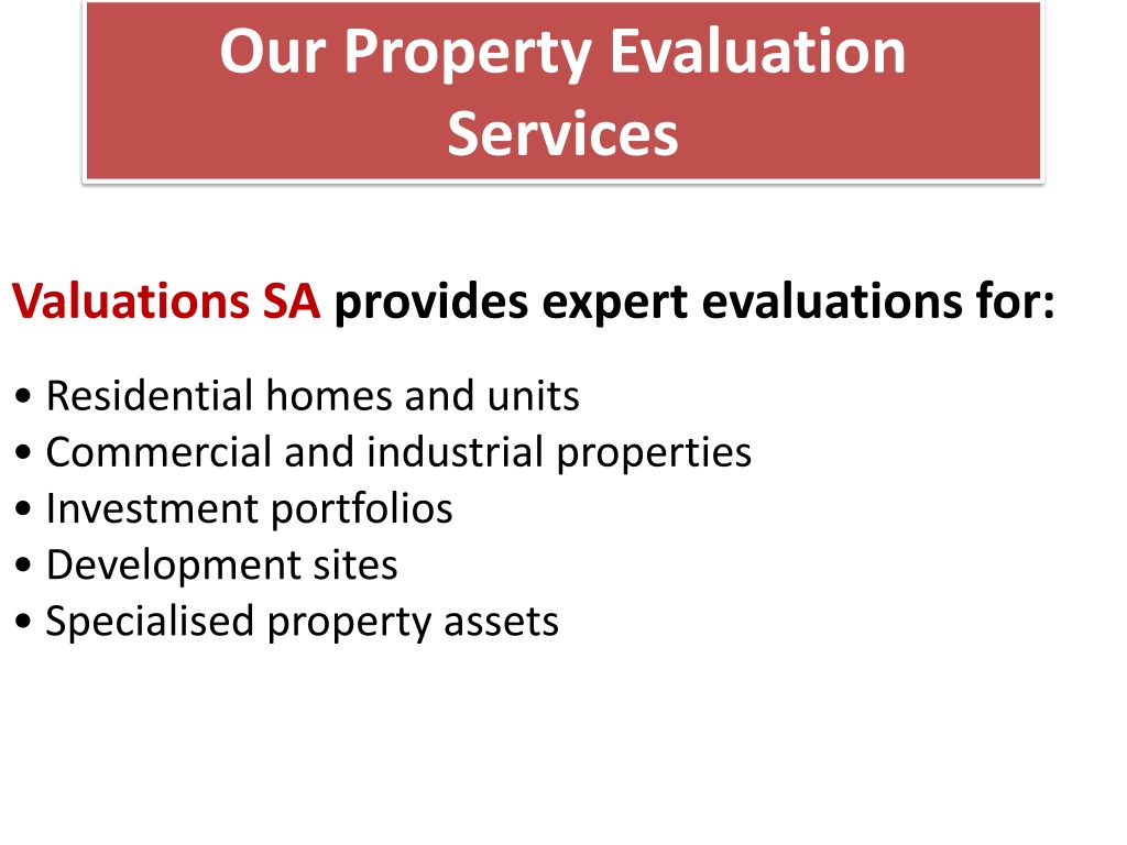 Valuations SA provides expert evaluations for: • Residential homes and units • Commercial and industrial properties • Investment portfolios • Development sites • Specialised property assets Our Property Evaluation Services