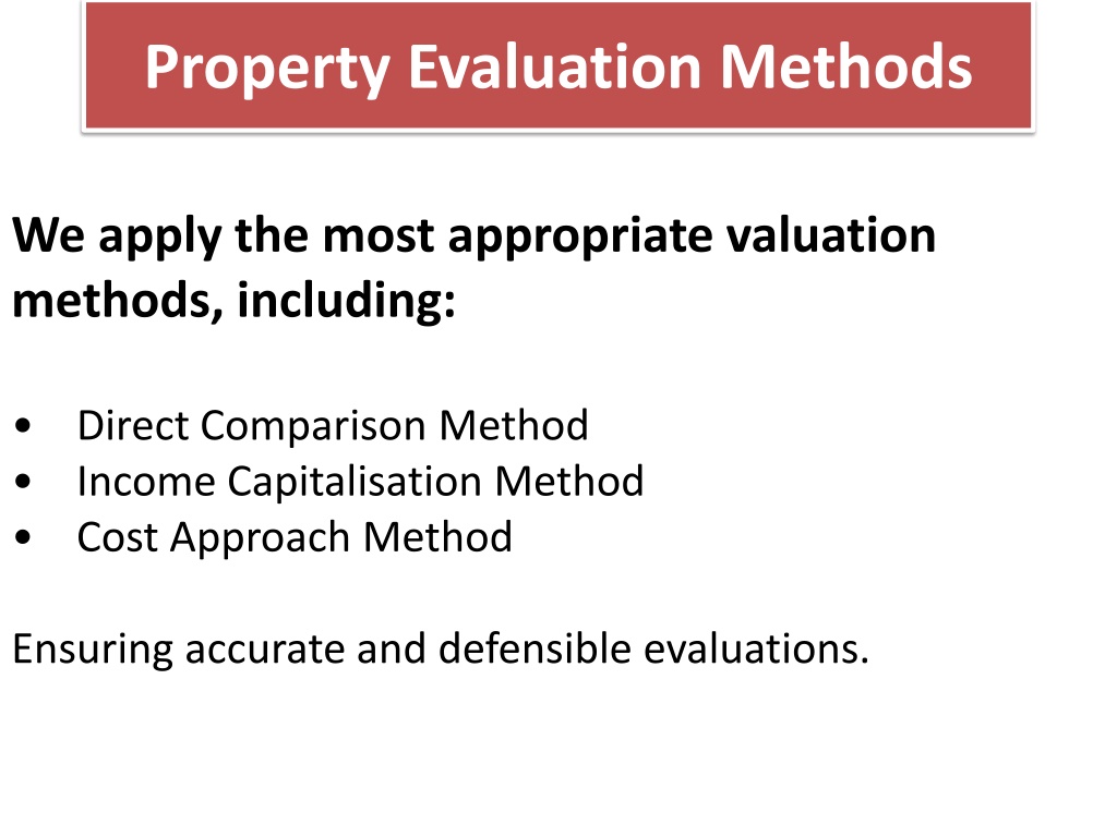 We apply the most appropriate valuation methods, including: • Direct Comparison Method • Income Capitalisation Method • Cost Approach Method Ensuring accurate and defensible evaluations. Property Evaluation Methods