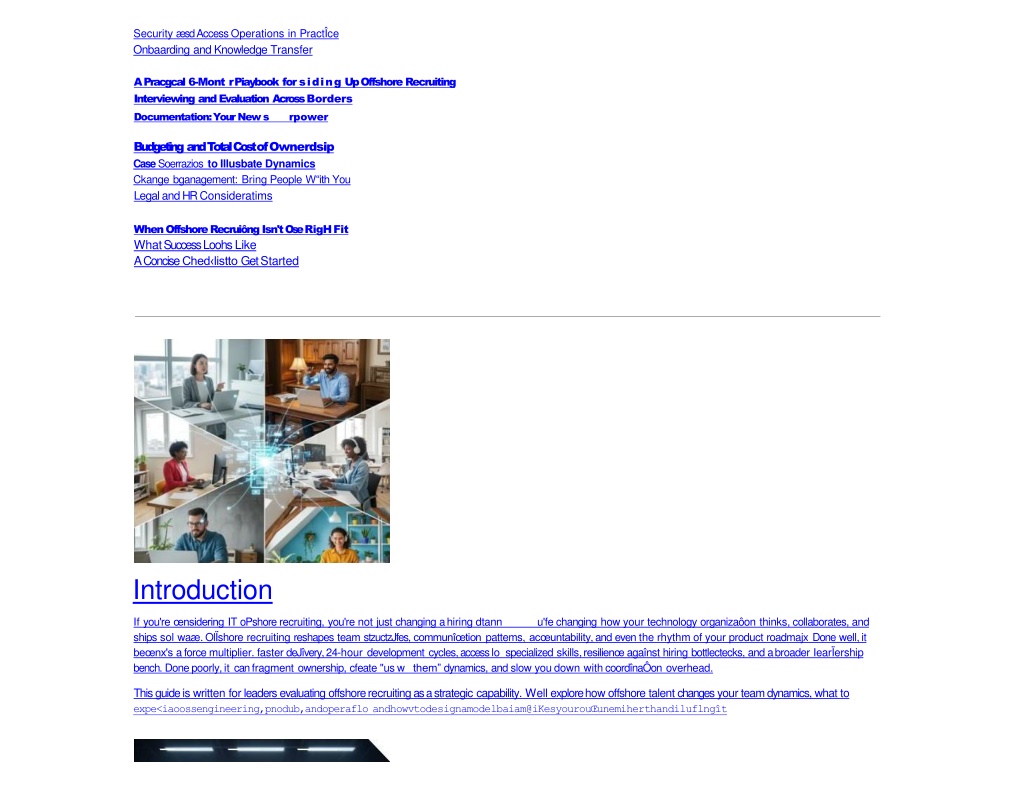 SecurityæsdAccessOperationsinPractÎce OnbaardingandKnowledgeTransfer APracgcal6-MontrPiaybookforsidingUpOffshoreRecruitingInterviewingandEvaluationAcrossBorders Documentation:YourNewsrpower BudgetingandTotalCostofOwnerdsip CaseSoerraziostoIllusbateDynamics Ckangebganagement:BringPeopleW“ithYou LegalandHRConsideratims WhenOffshoreRecruiôngIsn'tOseRigHFit WhatSuccessLoohsLike AConciseChed‹listtoGetStarted Introduction Ifyou'reœnsideringIToPshorerecruiting,you'renotjustchangingahiringdtannu'fechanginghowyourtechnologyorganizaôonthinks,collaborates,and shipssolwaæ.OlÏshorerecruiting reshapesteamstzuctzJfes,communîœtionpattems,acœuntability,andeventherhythmofyourproductroadmajxDonewell,it beœnx'sa forcemultiplier.fasterdeJîvery,24-hourdevelopmentcycles,accesslospecializedskills,resilienœagaînsthiringbottlectecks,andabroaderIearÏership bench.Donepoorly,itcanfragmentownership,cfeate"uswthem”dynamics,andslowyoudownwithcoordînaÔonoverhead. Thisguideiswritten forleadersevaluatingoffshorerecruitingasastrategiccapability.Wellexplorehowoffshoretalentchangesyourteamdynamics,whatto expe<iaoossengineering,pnodub,andoperafloandhowvtodesignamodelbaiam@iKesyourouŒunemiherthandiluflngît