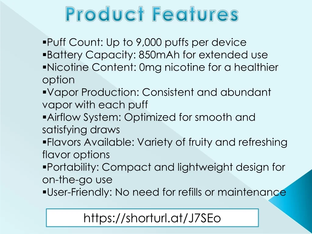 Product Features • Puff Count: Up to 9,000 puffs per device • Battery Capacity: 850mAh for extended use • Nicotine Content: 0mg nicotine for a healthier option • Vapor Production: Consistent and abundant vapor with each puff • Airflow System: Optimized for smooth and satisfying draws • Flavors Available: Variety of fruity and refreshing flavor options • Portability: Compact and lightweight design for on-the-go use • User-Friendly: No need for refills or maintenance https://shorturl.at/J7SEo