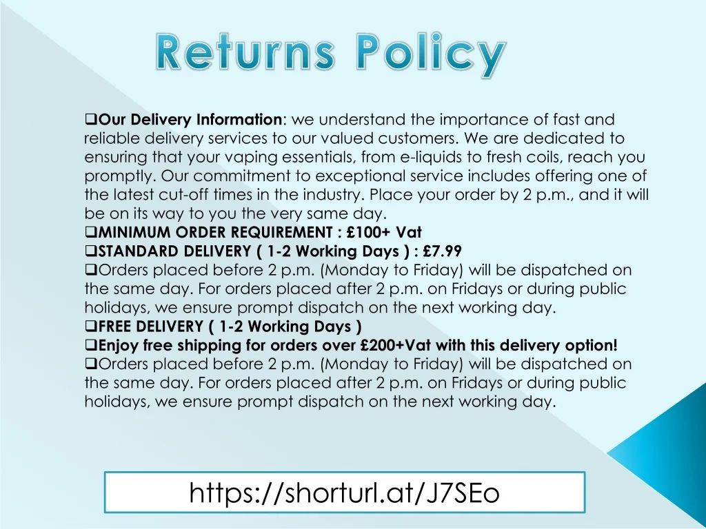 Returns Policy • Our Delivery Information: we understand the importance of fast and reliable delivery services to our valued customers. We are dedicated to ensuring that your vaping essentials, from e-liquids to fresh coils, reach you promptly. Our commitment to exceptional service includes offering one of the latest cut-off times in the industry. Place your order by 2 p.m., and it will be on its way to you the very same day. • MINIMUM ORDER REQUIREMENT : £100+ Vat • STANDARD DELIVERY ( 1-2 Working Days ) : £7.99 • Orders placed before 2 p.m. (Monday to Friday) will be dispatched on the same day. For orders placed after 2 p.m. on Fridays or during public holidays, we ensure prompt dispatch on the next working day. • FREE DELIVERY ( 1-2 Working Days ) • Enjoy free shipping for orders over £200+Vat with this delivery option! • Orders placed before 2 p.m. (Monday to Friday) will be dispatched on the same day. For orders placed after 2 p.m. on Fridays or during public holidays, we ensure prompt dispatch on the next working day. https://shorturl.at/J7SEo