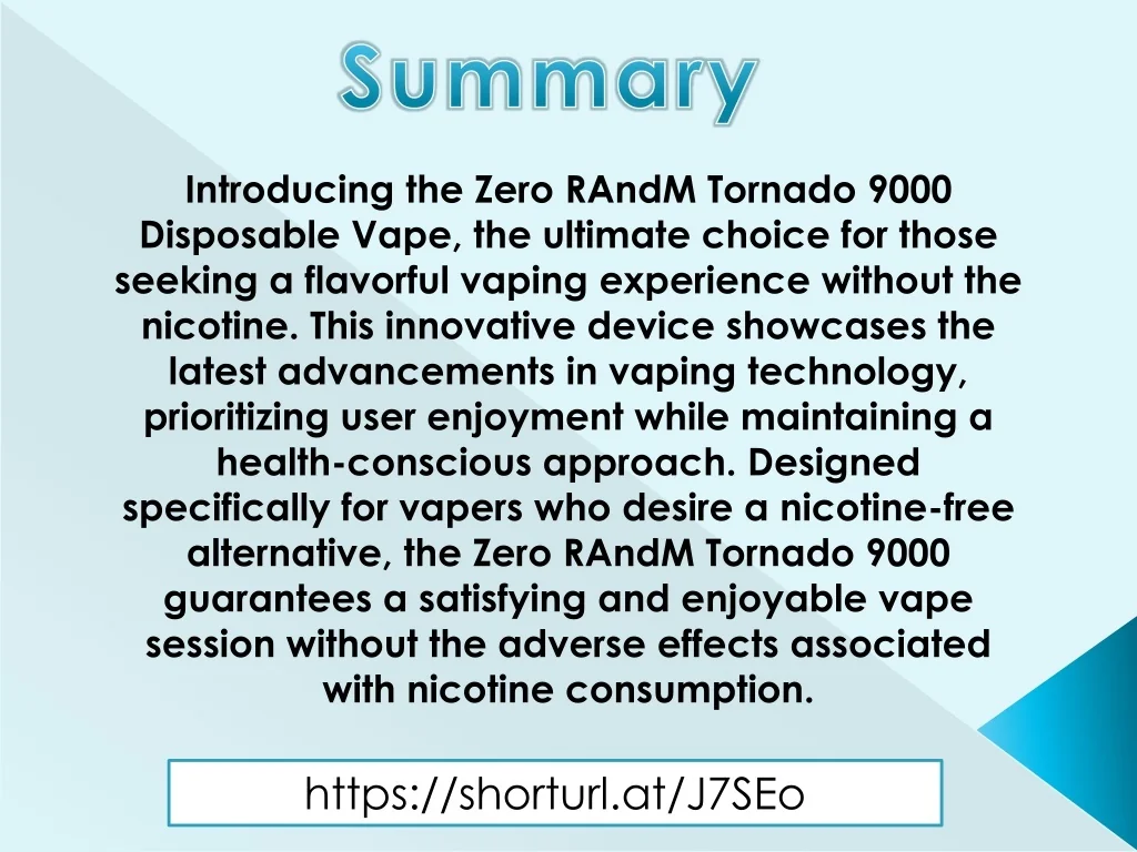 Summary Introducing the Zero RAndM Tornado 9000 Disposable Vape, the ultimate choice for those seeking a flavorful vaping experience without the nicotine. This innovative device showcases the latest advancements in vaping technology, prioritizing user enjoyment while maintaining a health-conscious approach. Designed specifically for vapers who desire a nicotine-free alternative, the Zero RAndM Tornado 9000 guarantees a satisfying and enjoyable vape session without the adverse effects associated with nicotine consumption. https://shorturl.at/J7SEo