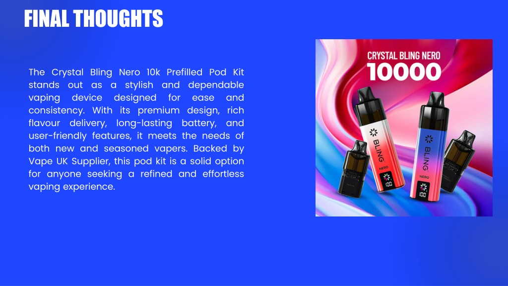 FINAL THOUGHTS The Crystal Bling Nero 10k Prefilled Pod Kit stands out as a stylish and dependable vaping device designed for ease and consistency. With its premium design, rich flavour delivery, long-lasting battery, and user-friendly features, it meets the needs of both new and seasoned vapers. Backed by Vape UK Supplier, this pod kit is a solid option for anyone seeking a refined and effortless vaping experience.