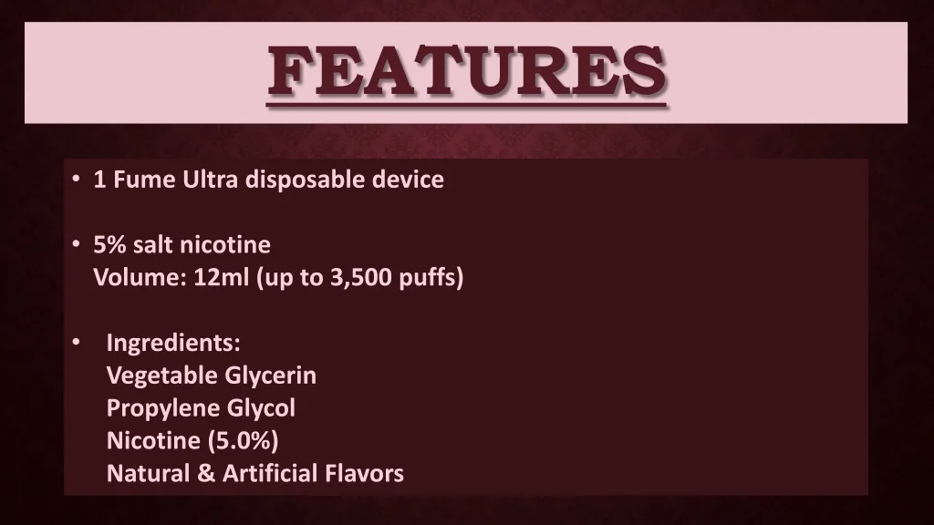 Features • 1 Fume Ultra disposable device • 5% salt nicotineVolume: 12ml (up to 3,500 puffs) • Ingredients:Vegetable GlycerinPropylene GlycolNicotine (5.0%)Natural & Artificial Flavors