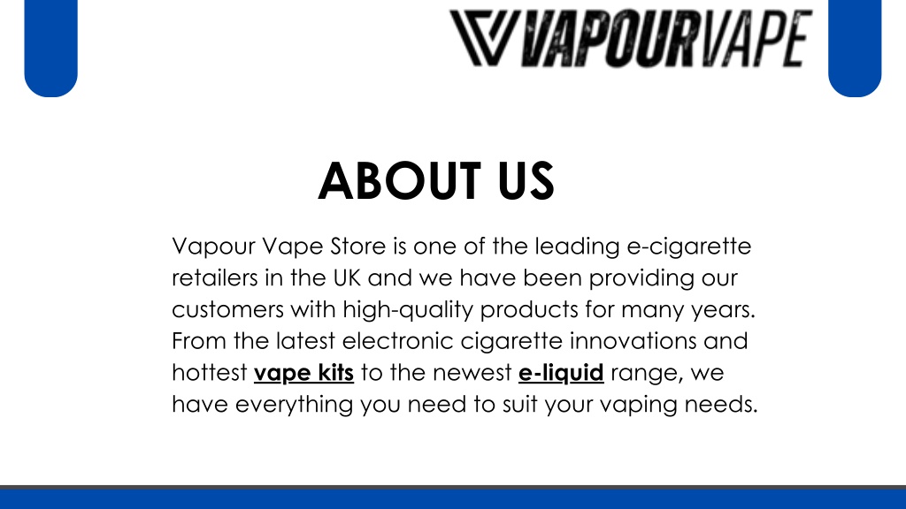 ABOUT US Vapour Vape Store is one of the leading e-cigarette retailers in the UK and we have been providing our customers with high-quality products for many years. From the latest electronic cigarette innovations and hottest vape kits to the newest e-liquid range, we have everything you need to suit your vaping needs.