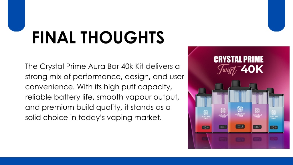 FINAL THOUGHTS The Crystal Prime Aura Bar 40k Kit delivers a strong mix of performance, design, and user convenience. With its high puff capacity, reliable battery life, smooth vapour output, and premium build quality, it stands as a solid choice in today’s vaping market.