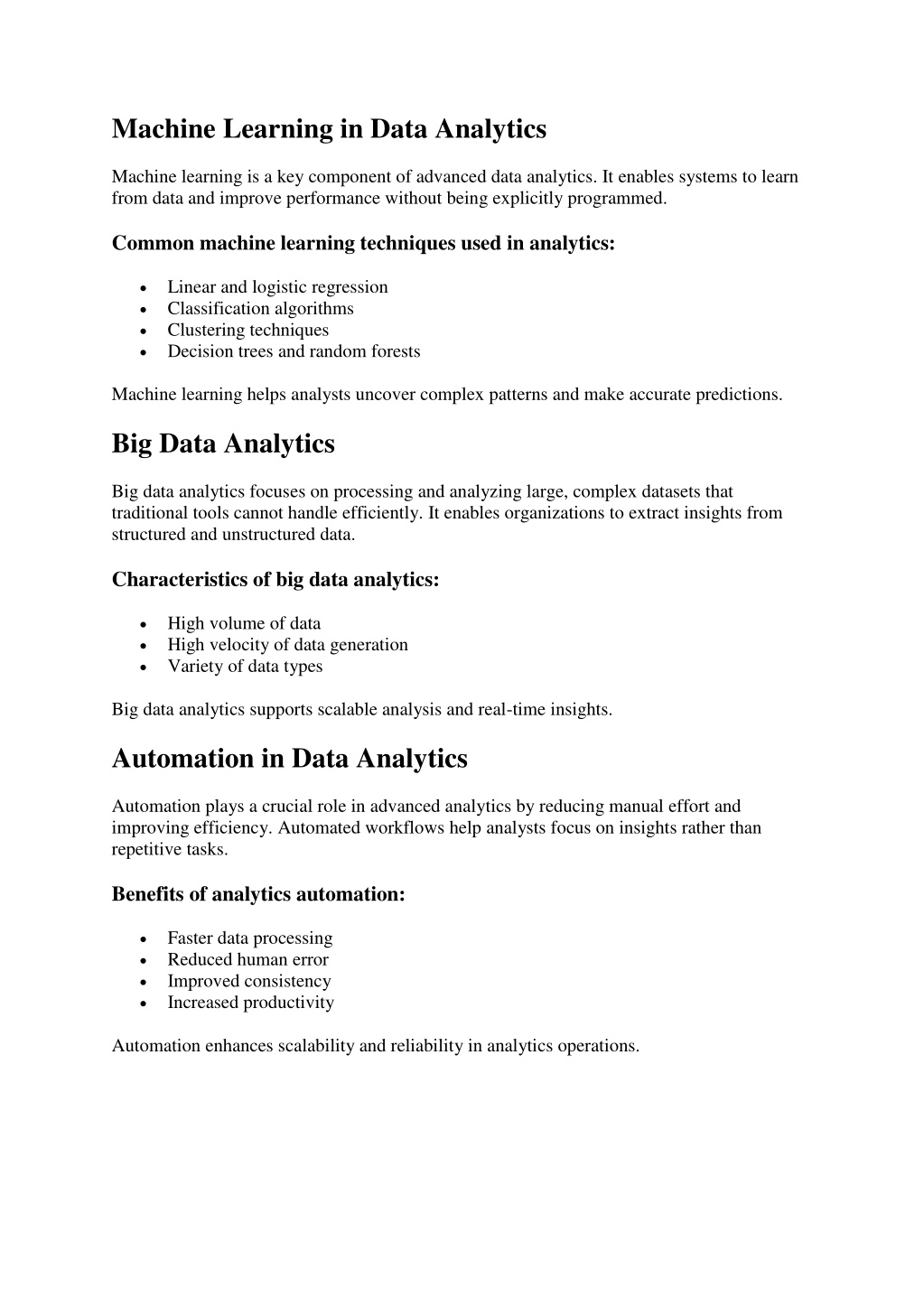 3. Machine Learning in Data Analytics Machine learning is a key component of advanced data analytics. It enables systems to learn from data and improve performance without being explicitly programmed. Common machine learning techniques used in analytics: Linear and logistic regression Classification algorithms Clustering techniques Decision trees and random forests Machine learning helps analysts uncover complex patterns and make accurate predictions. Big Data Analytics Big data analytics focuses on processing and analyzing large, complex datasets that traditional tools cannot handle efficiently. It enables organizations to extract insights from structured and unstructured data. Characteristics of big data analytics: High volume of data High velocity of data generation Variety of data types Big data analytics supports scalable analysis and real-time insights. Automation in Data Analytics Automation plays a crucial role in advanced analytics by reducing manual effort and improving efficiency. Automated workflows help analysts focus on insights rather than repetitive tasks. Benefits of analytics automation: Faster data processing Reduced human error Improved consistency Increased productivity Automation enhances scalability and reliability in analytics operations.