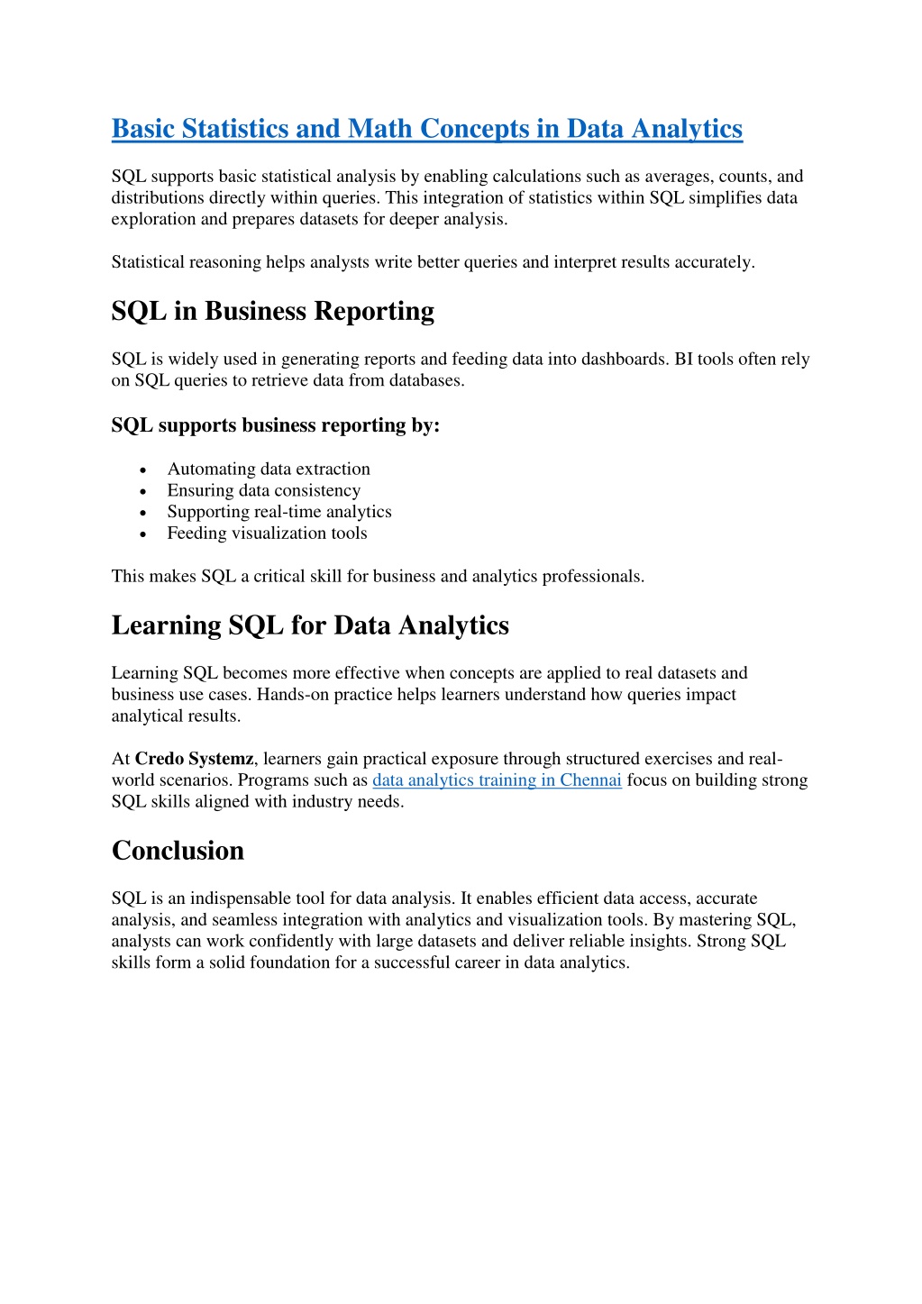 4. Basic Statistics and Math Concepts in Data Analytics SQL supports basic statistical analysis by enabling calculations such as averages, counts, and distributions directly within queries. This integration of statistics within SQL simplifies data exploration and prepares datasets for deeper analysis. Statistical reasoning helps analysts write better queries and interpret results accurately. SQL in Business Reporting SQL is widely used in generating reports and feeding data into dashboards. BI tools often rely on SQL queries to retrieve data from databases. SQL supports business reporting by: Automating data extraction Ensuring data consistency Supporting real-time analytics Feeding visualization tools This makes SQL a critical skill for business and analytics professionals. Learning SQL for Data Analytics Learning SQL becomes more effective when concepts are applied to real datasets and business use cases. Hands-on practice helps learners understand how queries impact analytical results. At Credo Systemz, learners gain practical exposure through structured exercises and real- world scenarios. Programs such as data analytics training in Chennai focus on building strong SQL skills aligned with industry needs. Conclusion SQL is an indispensable tool for data analysis. It enables efficient data access, accurate analysis, and seamless integration with analytics and visualization tools. By mastering SQL, analysts can work confidently with large datasets and deliver reliable insights. Strong SQL skills form a solid foundation for a successful career in data analytics.