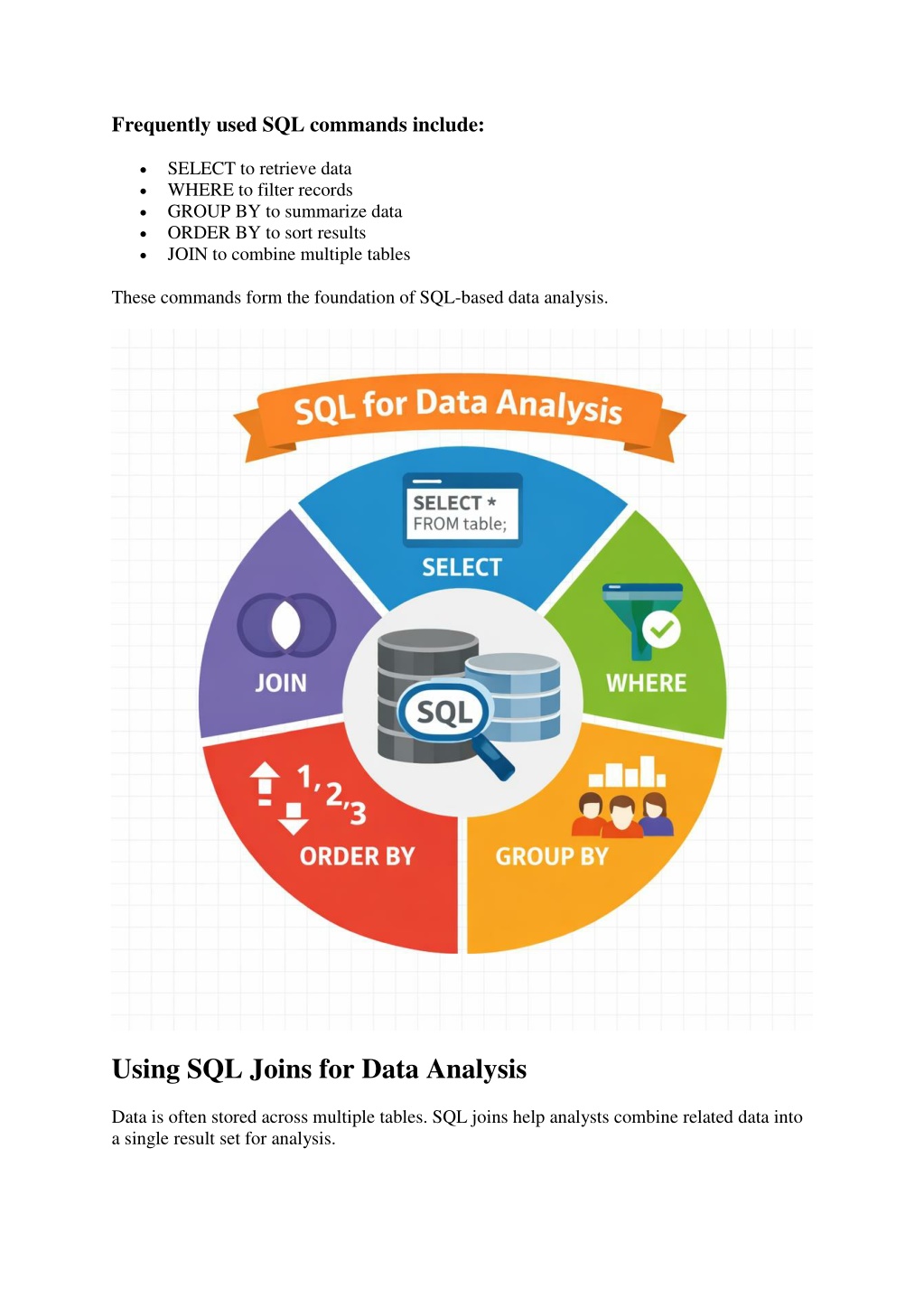 2. Frequently used SQL commands include: SELECT to retrieve data WHERE to filter records GROUP BY to summarize data ORDER BY to sort results JOIN to combine multiple tables These commands form the foundation of SQL-based data analysis. Using SQL Joins for Data Analysis Data is often stored across multiple tables. SQL joins help analysts combine related data into a single result set for analysis.