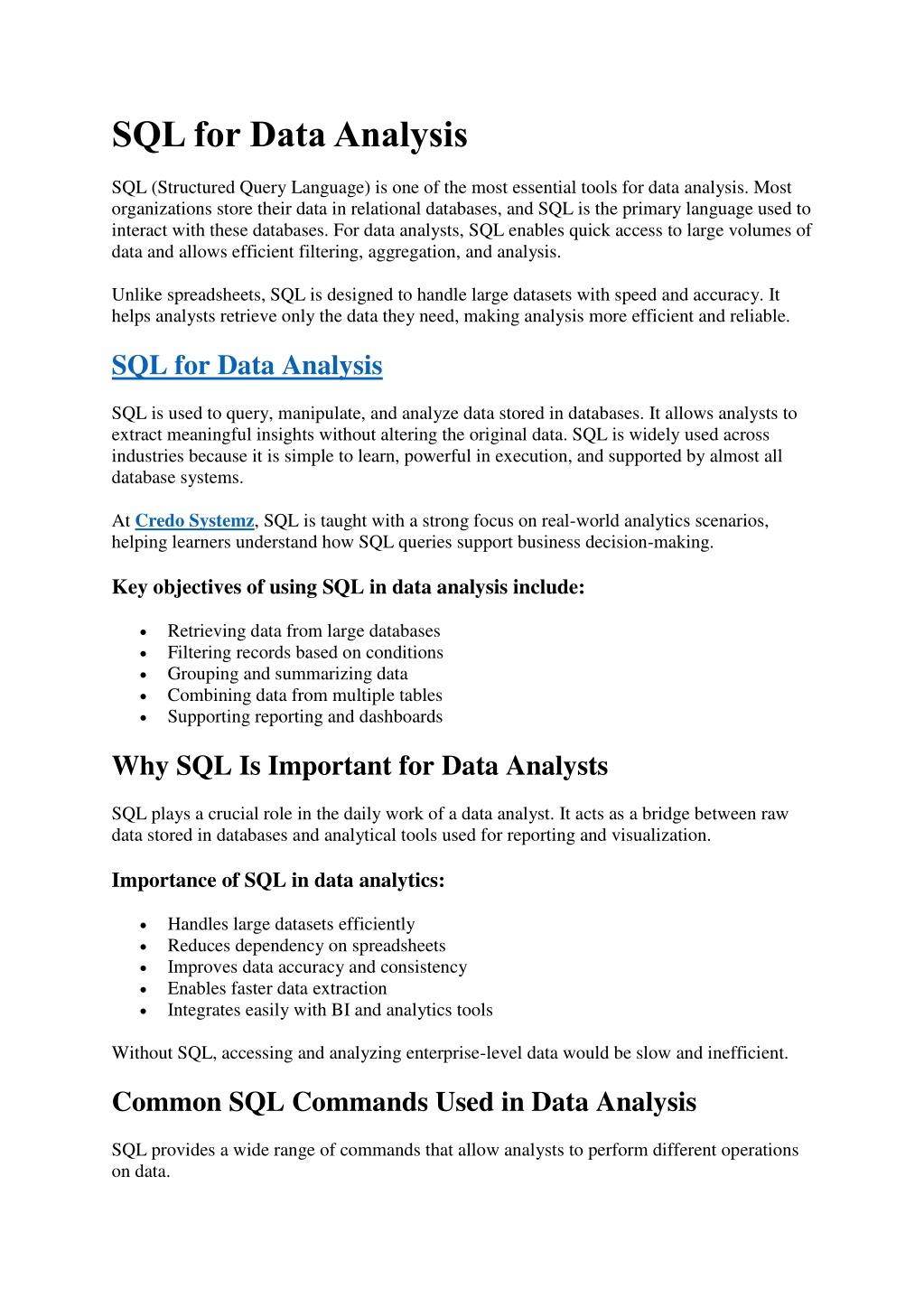 1. SQL for Data Analysis SQL (Structured Query Language) is one of the most essential tools for data analysis. Most organizations store their data in relational databases, and SQL is the primary language used to interact with these databases. For data analysts, SQL enables quick access to large volumes of data and allows efficient filtering, aggregation, and analysis. Unlike spreadsheets, SQL is designed to handle large datasets with speed and accuracy. It helps analysts retrieve only the data they need, making analysis more efficient and reliable. SQL for Data Analysis SQL is used to query, manipulate, and analyze data stored in databases. It allows analysts to extract meaningful insights without altering the original data. SQL is widely used across industries because it is simple to learn, powerful in execution, and supported by almost all database systems. At Credo Systemz, SQL is taught with a strong focus on real-world analytics scenarios, helping learners understand how SQL queries support business decision-making. Key objectives of using SQL in data analysis include: Retrieving data from large databases Filtering records based on conditions Grouping and summarizing data Combining data from multiple tables Supporting reporting and dashboards Why SQL Is Important for Data Analysts SQL plays a crucial role in the daily work of a data analyst. It acts as a bridge between raw data stored in databases and analytical tools used for reporting and visualization. Importance of SQL in data analytics: Handles large datasets efficiently Reduces dependency on spreadsheets Improves data accuracy and consistency Enables faster data extraction Integrates easily with BI and analytics tools Without SQL, accessing and analyzing enterprise-level data would be slow and inefficient. Common SQL Commands Used in Data Analysis SQL provides a wide range of commands that allow analysts to perform different operations on data.