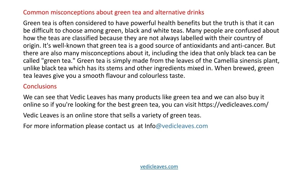 Common misconceptions about green tea and alternative drinks Green tea is often considered to have powerful health benefits but the truth is that it can be difficult to choose among green, black and white teas. Many people are confused about how the teas are classified because they are not always labelled with their country of origin. It's well-known that green tea is a good source of antioxidants and anti-cancer. But there are also many misconceptions about it, including the idea that only black tea can be called "green tea." Green tea is simply made from the leaves of the Camellia sinensis plant, unlike black tea which has its stems and other ingredients mixed in. When brewed, green tea leaves give you a smooth flavour and colourless taste. Conclusions We can see that Vedic Leaves has many products like green tea and we can also buy it online so if you're looking for the best green tea, you can visit https://vedicleaves.com/ Vedic Leaves is an online store that sells a variety of green teas. For more information please contact us at Info@vedicleaves.com vedicleaves.com